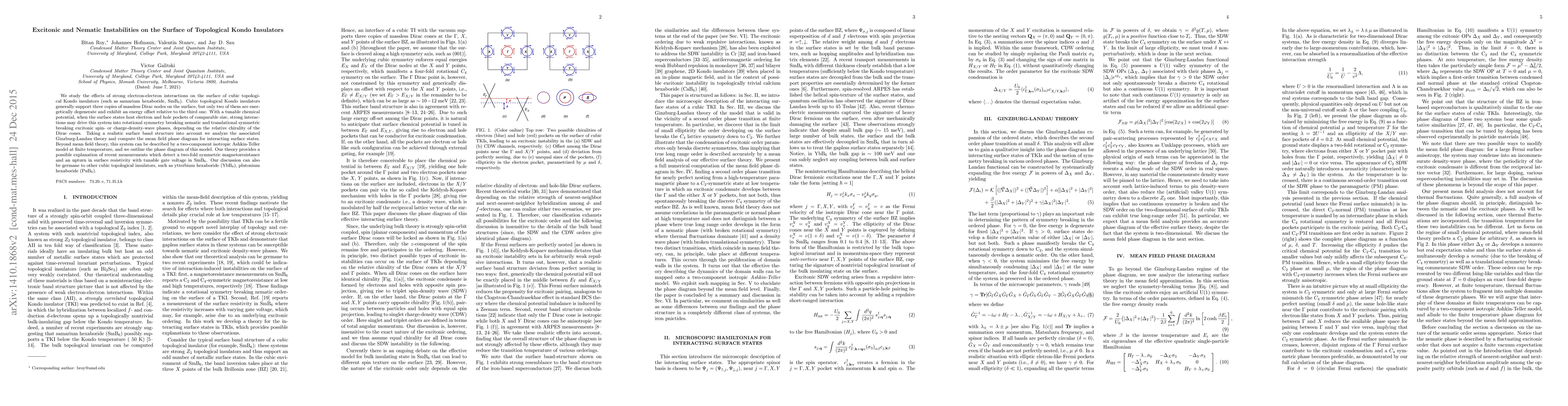 This paper investigates strong electron-electron interactions on the surface of cubic topological Kondo insulators, predicting nematic and excitonic instabilities that lead to symmetry-breaking phases. The study uses Ginzburg-Landau theory and the Ashkin-Teller model to explain observed magnetoresistance and resistivity changes in materials like SmB$_6$.