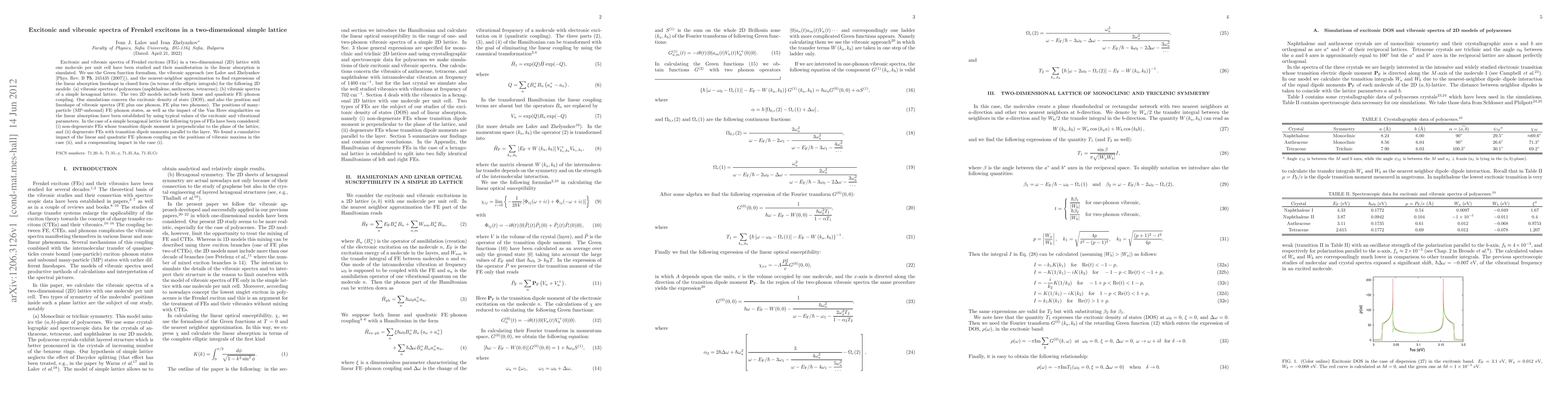 Excitonic and vibronic spectra of Frenkel excitons (FEs) in a two-dimensional (2D) lattice with one molecule per unit cell have been studied and their manifestation in the linear absorption is simulated. We use the Green function formalism, the vibronic approach (see Lalov and Zhelyazkov [Phys. Rev. B \textbf{75}, 245435 (2007)]), and the nearest-neighbor approximation to find expressions of the linear absorption lineshape in closed form (in terms of the elliptic integrals) for the following 2D models: (a) vibronic spectra of polyacenes (naphthalene, anthracene, tetracene); (b) vibronic spectra of a simple hexagonal lattice. The two 2D models include both linear and quadratic FE--phonon coupling. Our simulations concern the excitonic density of state (DOS), and also the position and lineshape of vibronic spectra (FE plus one phonon, FE plus two phonons). The positions of many-particle (MP-unbound) FE--phonon states, as well as the impact of the Van Hove singularities on the linear absorption have been established by using typical values of the excitonic and vibrational parameters. In the case of a simple hexagonal lattice the following types of FEs have been considered: (i) non-degenerate FEs whose transition dipole moment is perpendicular to the plane of the lattice, and (ii) degenerate FEs with transition dipole moments parallel to the layer. We found a cumulative impact of the linear and quadratic FE--phonon coupling on the positions of vibronic maxima in the case (ii), and a compensating impact in the case (i).