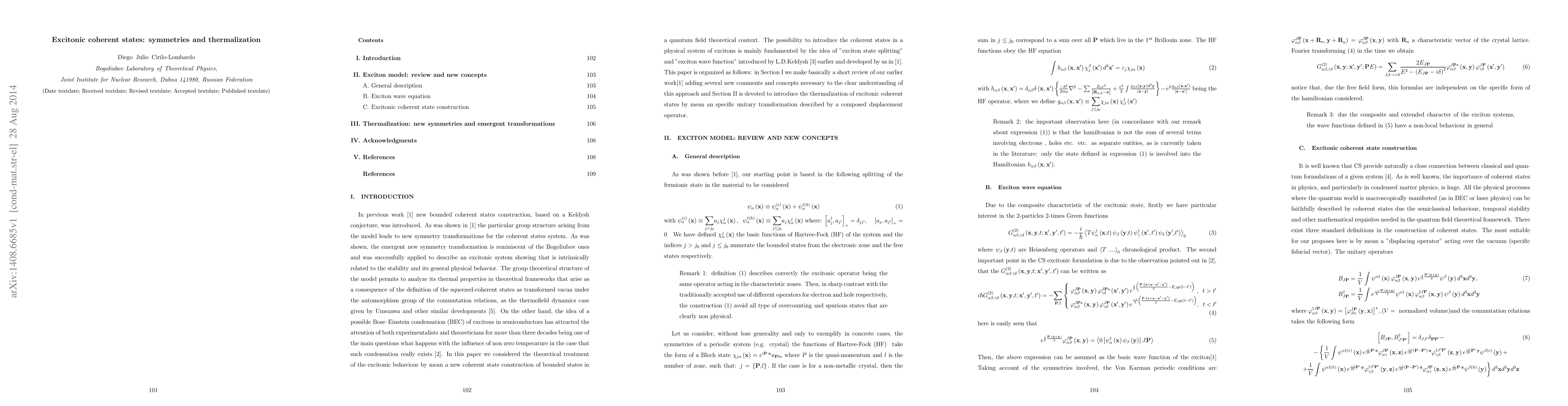 In previous work [1] new bounded coherent states construction, based on a Keldysh conjecture, was introduced. As was shown in [1] the particular group structure arising from the model leads to new symmetry transformations for the coherent states system. As was shown, the emergent new symmetry transformation is reminiscent of the Bogoliubov ones and was successfully applied to describe an excitonic system showing that is intrinsically related to the stability and its general physical behavior. The group theoretical structure of the model permits to analyze its thermal properties in theoretical frameworks that arise as a consequence of the definition of the squeezed-coherent states as transformed vacua under the automorphism group of the commutation relations, as the thermofield dynamics case given by Umezawa and other similar developments [5]. On the other hand, the idea of a possible Bose--Einstein condensation (BEC) of excitons in semiconductors has attracted the attention of both experimentalists and theoreticians for more than three decades being one of the main questions what happens with the influence of non zero temperature in the case that such condensation really exists [2]. In this paper we considered the theoretical treatment of the excitonic behaviour by mean a new coherent state construction of bounded states in a quantum field theoretical context.