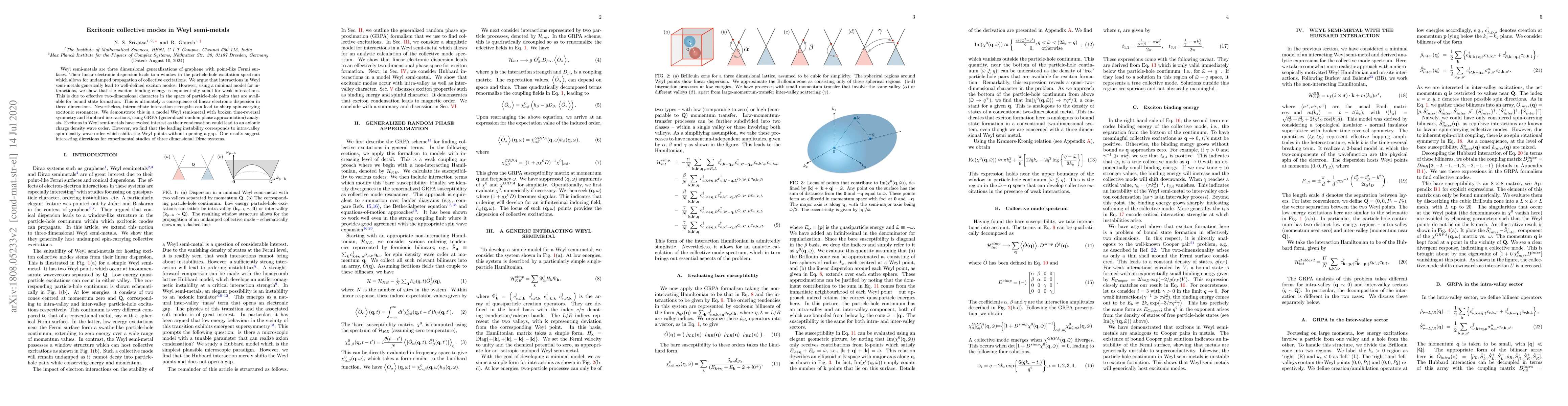 This paper explores excitonic collective modes in Weyl semi-metals, finding that while weak interactions lead to exponentially small exciton binding energies, intermediate interactions can create sharp spin-carrying excitonic resonances. The study highlights the potential for spin density wave order rather than an axionic charge density wave.