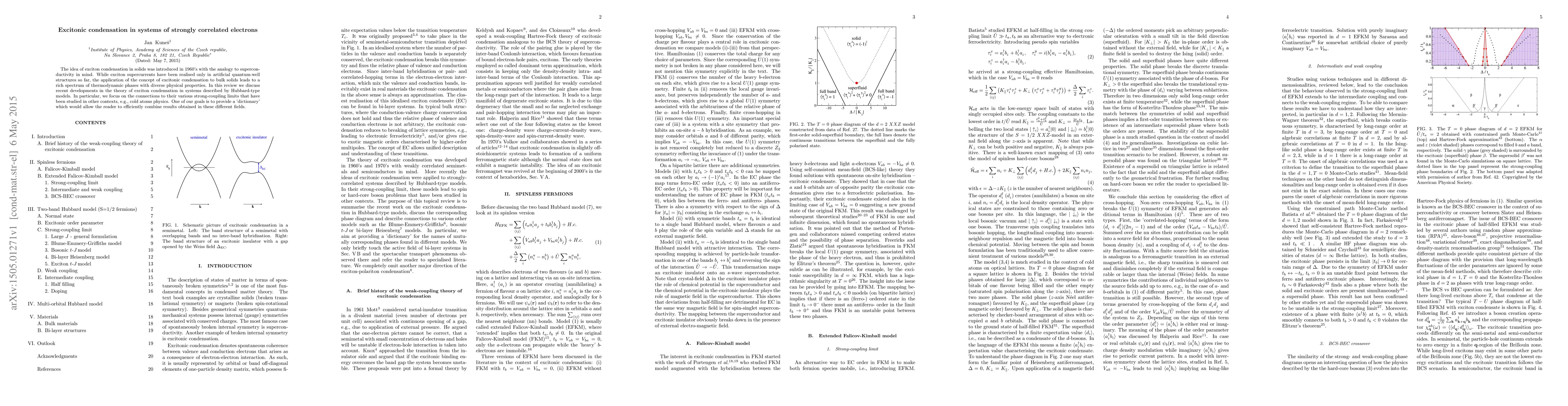 The idea of exciton condensation in solids was introduced in 1960's with the analogy to superconductivity in mind. While exciton supercurrents have been realized only in artificial quantum-well structures so far, the application of the concept of excitonic condensation to bulk solids leads to a rich spectrum of thermodynamic phases with diverse physical properties. In this review we discuss recent developments in the theory of exciton condensation in systems described by Hubbard-type models. In particular, we focus on the connections to their various strong-coupling limits that have been studied in other contexts, e.g., cold atoms physics. One of our goals is to provide a 'dictionary' which would allow the reader to efficiently combine results obtained in these different fields.