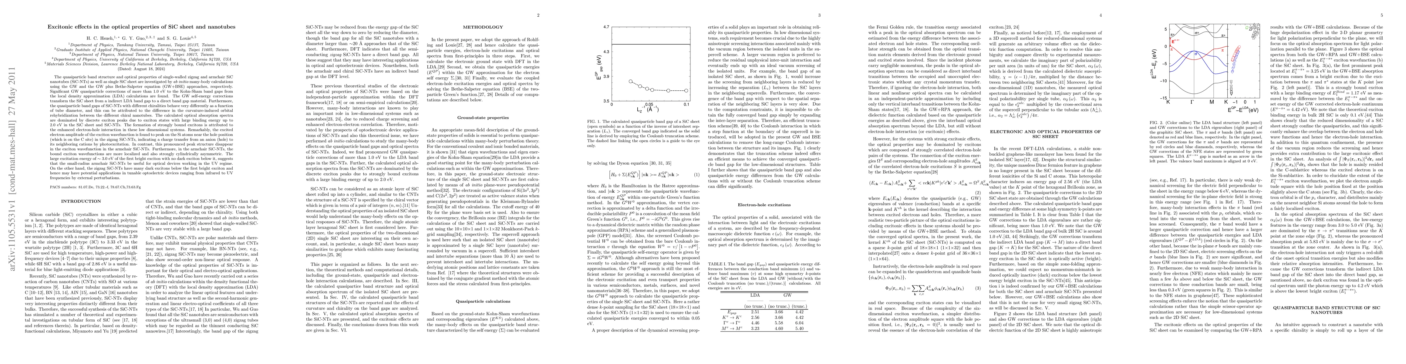 The quasiparticle band structure and optical properties of single-walled zigzag and armchair SiC nanotubes (SiC-NTs) as well as single SiC sheet are investigated by ab initio many-body calculations using the GW and the GW plus Bethe-Salpeter equation (GW+BSE) approaches, respectively. Significant GW quasiparticle corrections of more than 1.0 eV to the Kohn-Sham band gaps from the local density approximation (LDA) calculations are found. The GW self-energy corrections transform the SiC sheet from a indirect LDA band gap to a direct band gap material. Furthermore, the quasiparticle band gaps of SiC-NTs with different chiralities behave very differently as a function of tube diameter, and this can be attributed to the difference in the curvature-induced orbital rehybridization between the different chiral nanotubes. The calculated optical absorption spectra are dominated by discrete exciton peaks due to exciton states with large binding energy up to 2.0 eV in the SiC sheet and SiC-NTs. The formation of strongly bound excitons is attributed to the enhanced electron-hole interaction in these low dimensional systems. Remarkably, the excited electron amplitude of the exciton wavefunction is found to peak on the Si atoms near the hole position (which is on the C site) in the zigzag SiC-NTs, indicating a charge transfer from an anion (hole) to its neighboring cations by photoexcitation. In contrast, this pronounced peak structure disappear in the exciton wavefunction in the armchair SiC-NTs. Furthermore, in the armchair SiC-NTs, the bound exciton wavefunctions are more localized and also strongly cylindrically asymmetric.