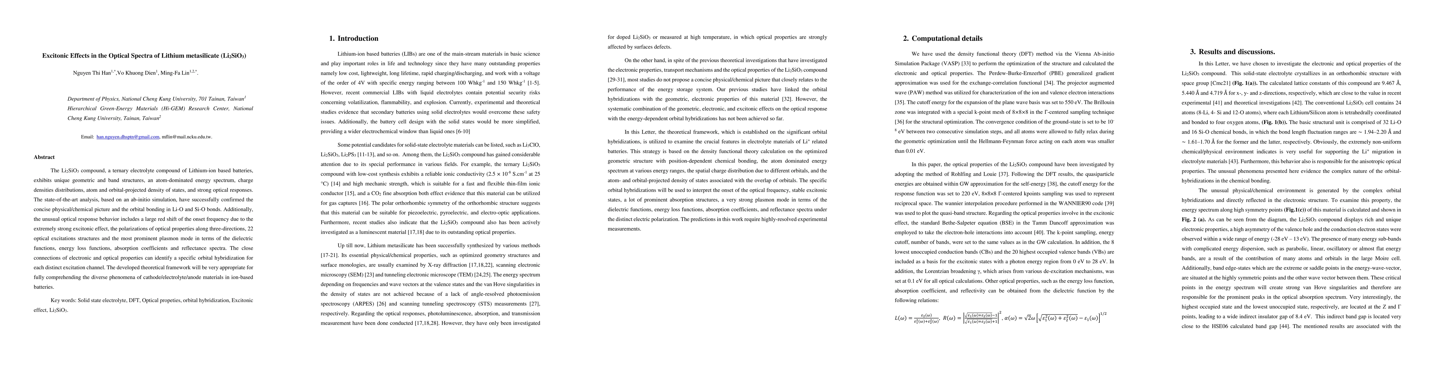 A study on Lithium metasilicate (Li2SiO3) reveals strong excitonic effects leading to unique optical responses, including a large redshift of the onset frequency and polarization of properties along three directions. The findings provide insights into understanding cathode/electrolyte/anode materials in ion-based batteries.
