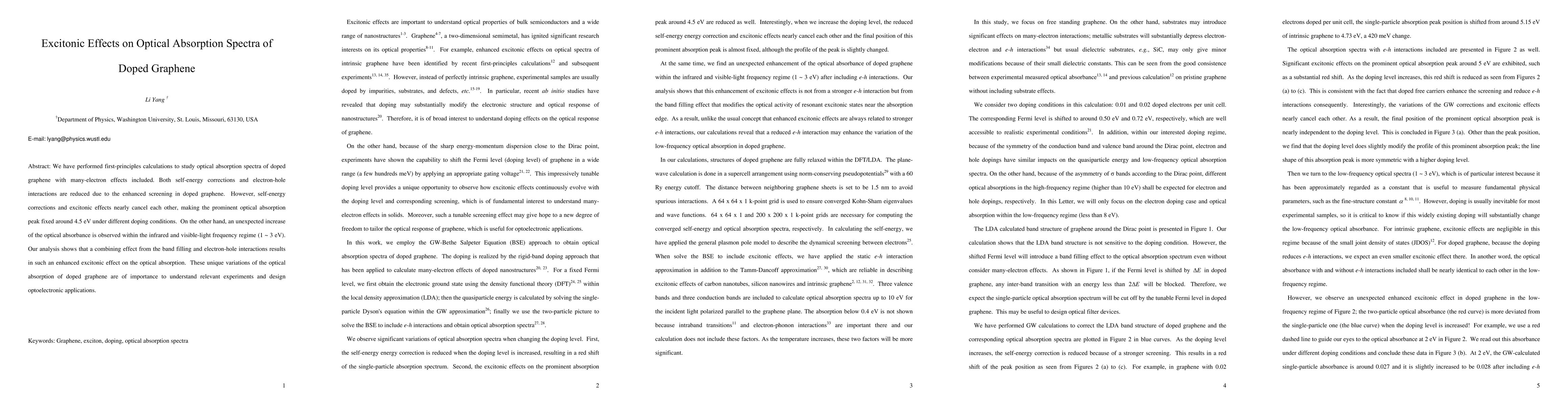 This study uses first-principles calculations to reveal that excitonic effects and self-energy corrections nearly cancel each other in doped graphene, maintaining a fixed optical absorption peak at 4.5 eV. An unexpected increase in optical absorbance within the infrared and visible range (1-3 eV) is due to a combination of band filling and electron-hole interactions.
