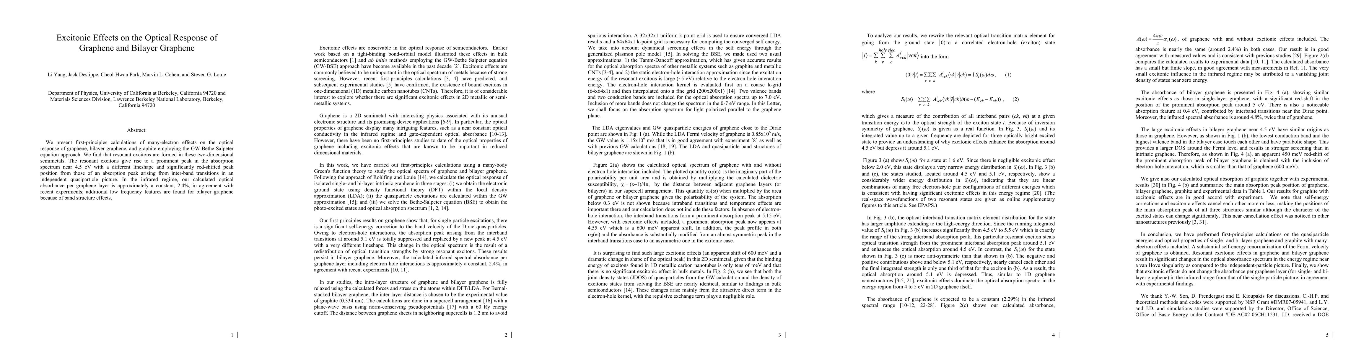 This paper uses first-principles calculations to investigate the optical response of graphene and bilayer graphene, revealing the formation of resonant excitons that significantly alter absorption spectra. The study finds a prominent peak near 4.5 eV due to excitons, differing from interband transition peaks, and confirms a constant infrared absorbance of 2.4% per graphene layer.