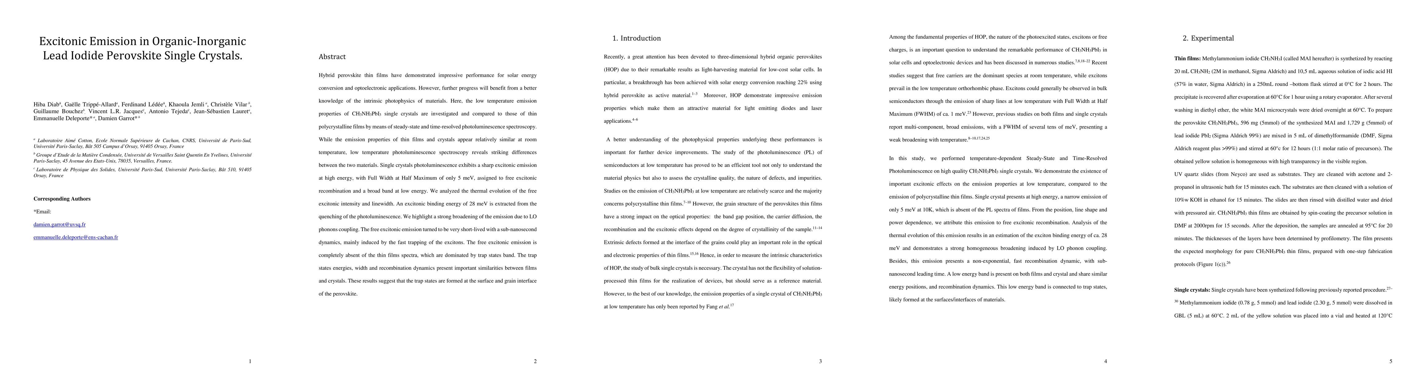 Hybrid perovskite single crystals exhibit sharp excitonic emission at low temperature, while thin films display broad emission dominated by trap states. This suggests that surface and grain interface formation of trap states affects thin film photophysics.