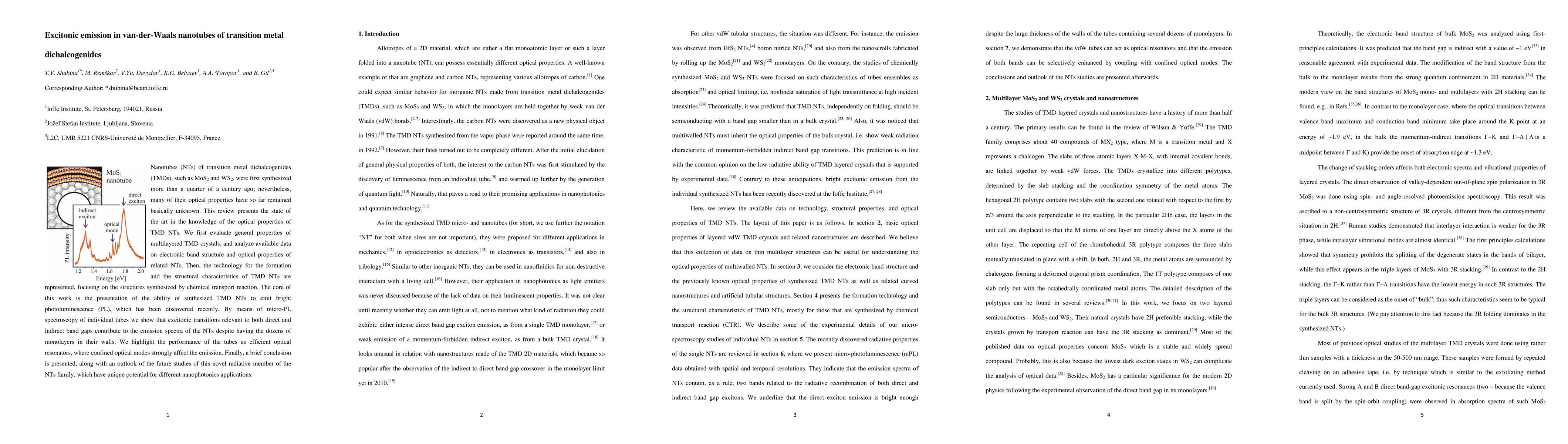 Nanotubes (NTs) of transition metal dichalcogenides (TMDs), such as MoS2 and WS2, were first synthesized more than a quarter of a century ago; nevertheless, many of their properties have so far remained basically unknown. This review presents the state of the art in the knowledge of the optical properties of TMD NTs. We first evaluate general properties of multilayered TMD crystals, and analyze available data on electronic band structure and optical properties of related NTs. Then, the technology for the formation and the structural characteristics of TMD NTs are represented, focusing on the structures synthesized by chemical transport reaction. The core of this work is the presentation of the ability of TMD NTs to emit bright photoluminescence (PL), which has been discovered recently. By means of micro-PL spectroscopy of individual tubes we show that excitonic transitions relevant to both direct and indirect band gaps contribute to the emission spectra of the NTs despite the presence of dozens of monolayers in their walls. We highlight the performance of the tubes as efficient optical resonators, whose confined optical modes strongly affect the emission bands. Finally, a brief conclusion is presented, along with an outlook of the future studies of this novel member of the family of radiative NTs, which have unique potential for different nanophotonics applications.