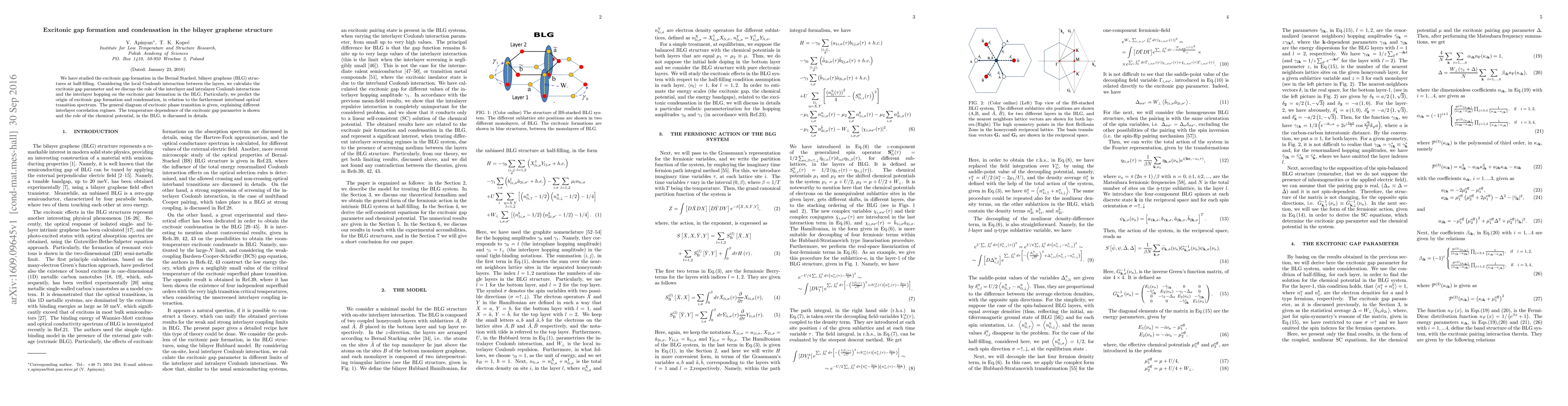 We have studied the excitonic gap formation in the Bernal Stacked, bilayer graphene (BLG) structures at half-filling. Considering the local Coulomb interaction between the layers, we calculate the excitonic gap parameter and we discuss the role of the interlayer and intralayer Coulomb interactions and the interlayer hopping on the excitonic pair formation in the BLG. Particularly, we predict the origin of excitonic gap formation and condensation, in relation to the farthermost interband optical transition spectrum. The general diagram of excitonic phase transition is given, explaining different interlayer correlation regimes. The temperature dependence of the excitonic gap parameter is shown and the role of the chemical potential, in the BLG, is discussed in details.