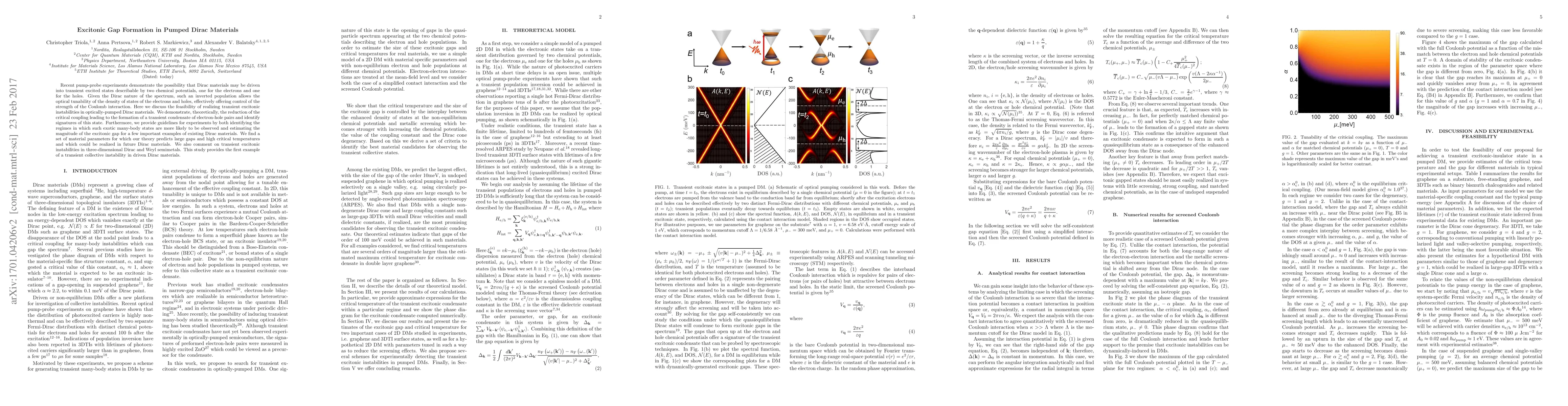 This paper explores the possibility of transient excitonic instabilities in optically-pumped Dirac materials, demonstrating theoretically the formation of a condensate of electron-hole pairs and identifying signatures of this state, while providing guidelines for future experimental observations. The study predicts large excitonic gaps and high critical temperatures in specific material parameters.