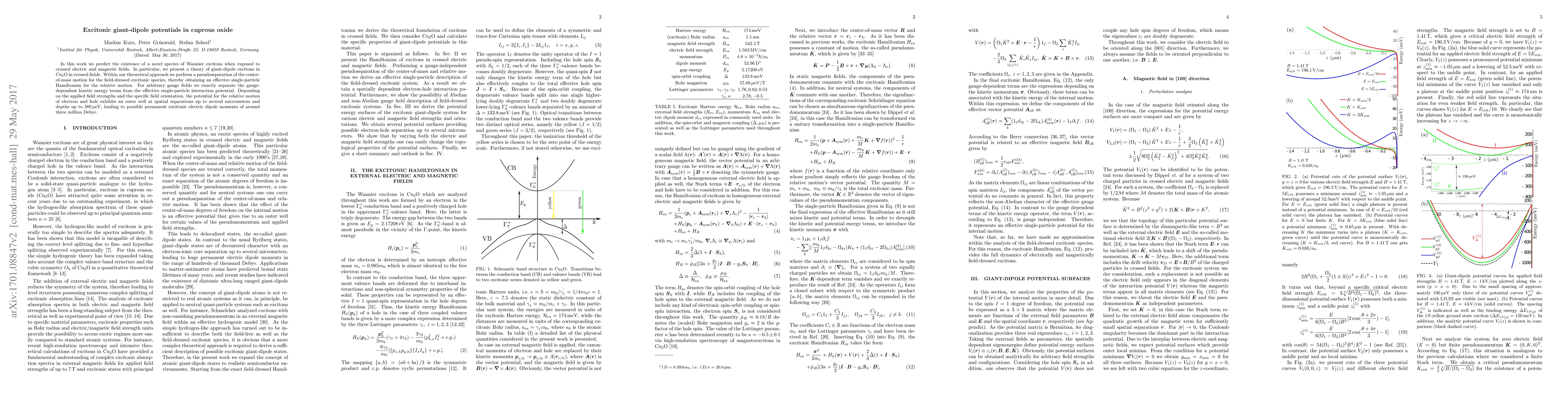 This research predicts the existence of novel Wannier excitons in cuprous oxide under crossed electric and magnetic fields, termed giant-dipole excitons. The study develops a theoretical framework to analyze the effective single-particle Hamiltonian, revealing potentials with deep outer wells capable of generating permanent excitonic electric dipole moments up to three million Debye.