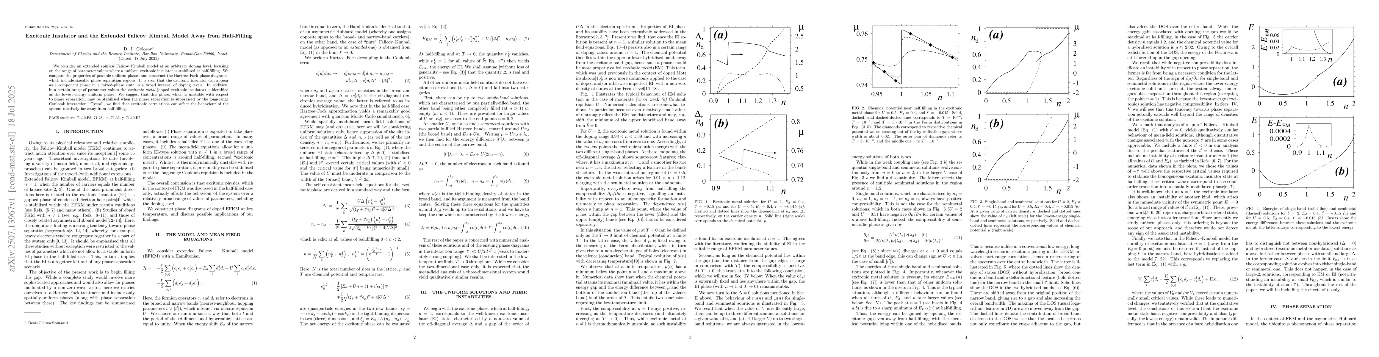 We consider an extended spinless Falicov--Kimball model at an arbitrary doping level, focusing on the range of parameter values where a uniform excitonic insulator is stabilised at half-filling. We compare the properties of possible uniform phases and construct the Hartree--Fock phase diagrams, which include sizeable phase separation regions. It is seen that the excitonic insulator can appear as a component phase in a mixed-phase state in a broad interval of doping levels. In addition, in a certain range of parameter values the excitonic metal (doped excitonic insulator) is identified as the lowest-energy uniform phase. We suggest that this phase, which is unstable with respect to phase separation, may be stabilised when the phase separation is suppressed by the long-range Coulomb interaction. Overall, we find that excitonic correlations can affect the behaviour of the system relatively far away from half-filling.