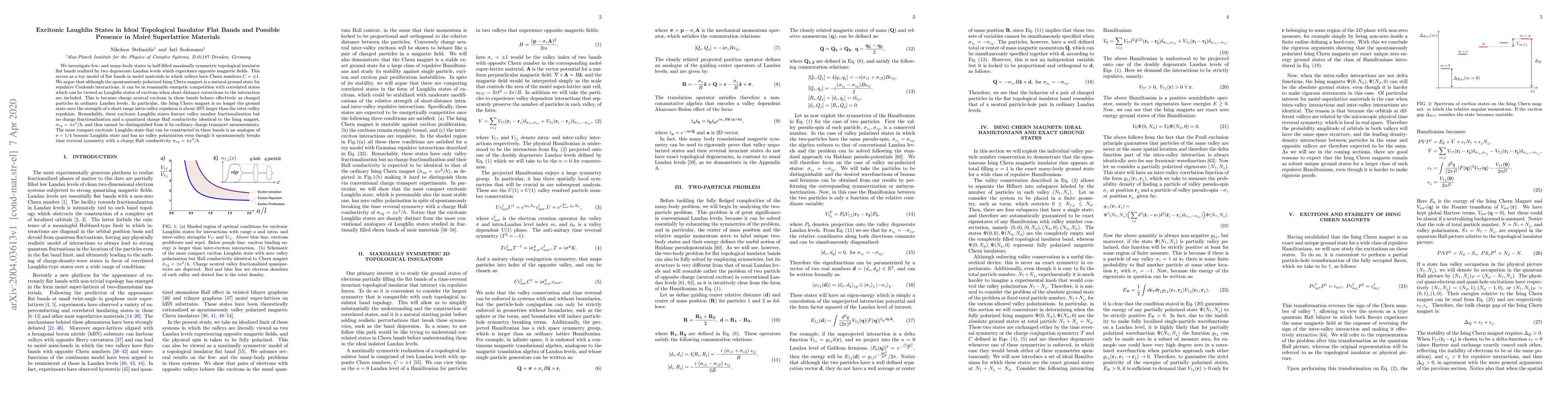 We investigate few- and many-body states in half-filled maximally symmetric topological insulator flat bands realized by two degenerate Landau levels which experience opposite magnetic fields. This serves as a toy model of flat bands in moir\'e materials in which valleys have Chern numbers $C= \pm 1$. We argue that although the spontaneously polarized Ising Chern magnet is a natural ground state for repulsive Coulomb interactions, it can be in reasonable energetic competition with correlated states which can be viewed as Laughlin states of excitons when short distance corrections to the interaction are included. This is because charge neutral excitons in these bands behave effectively as charged particles in ordinary Landau levels. In particular, the Ising Chern magnet is no longer the ground state once the strength of a short range intra-valley repulsion is about $30\%$ larger than the inter-valley repulsion. Remarkably, these excitonic Laughlin states feature valley number fractionalization but no charge fractionalization and a quantized charge Hall conductivity identical to the Ising magnet, $\sigma_{xy}= \pm e^2/h$, and thus cannot be distinguished from it by ordinary charge transport measurements. The most compact excitonic Laughlin state that can be constructed in these bands is an analogue of $\nu=1/4$ bosonic Laughlin state and has no valley polarization even though it spontaneously breaks time reversal symmetry with a charge Hall conductivity $\sigma_{xy}= \pm e^2/h$.