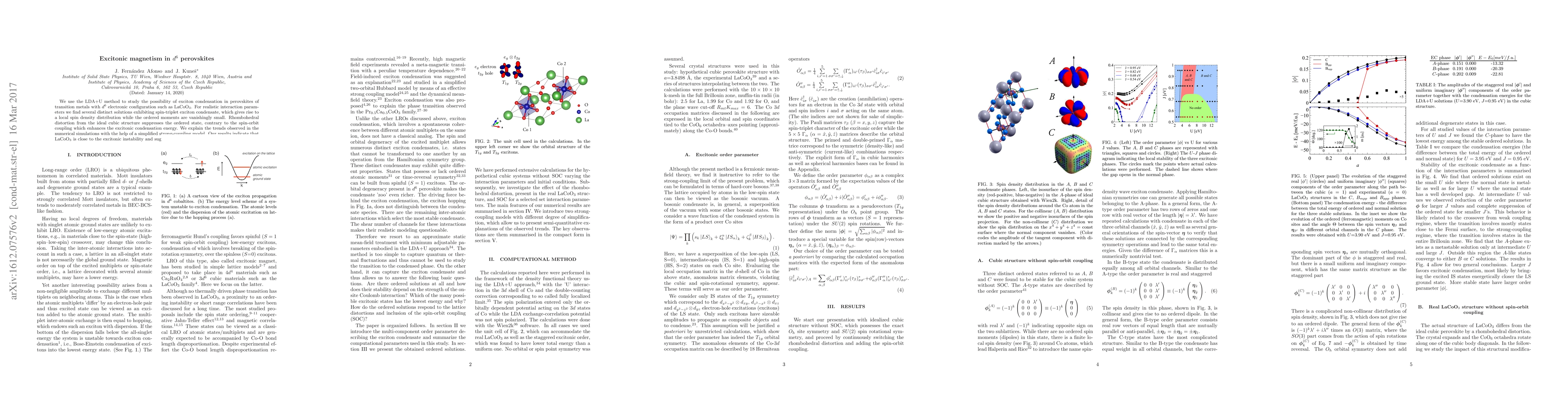 We use the LDA+U method to study the possibility of exciton condensation in perovskites of transition metals with $d^6$ electronic configuration such as LaCoO$_3$. For realistic interaction parameters we find several distinct solutions exhibiting spin-triplet exciton condensate, which gives rise to a local spin density distribution while the ordered moments are vanishingly small. Rhombohedral distortion from the ideal cubic structure suppresses the ordered state, contrary to the spin-orbit coupling which enhances the excitonic condensation energy. We explain the trends observed in the numerical simulations with the help of a simplified strong-coupling model. Our results indicate that LaCoO$_3$ is close to the excitonic instability and suggest ways to make it order.