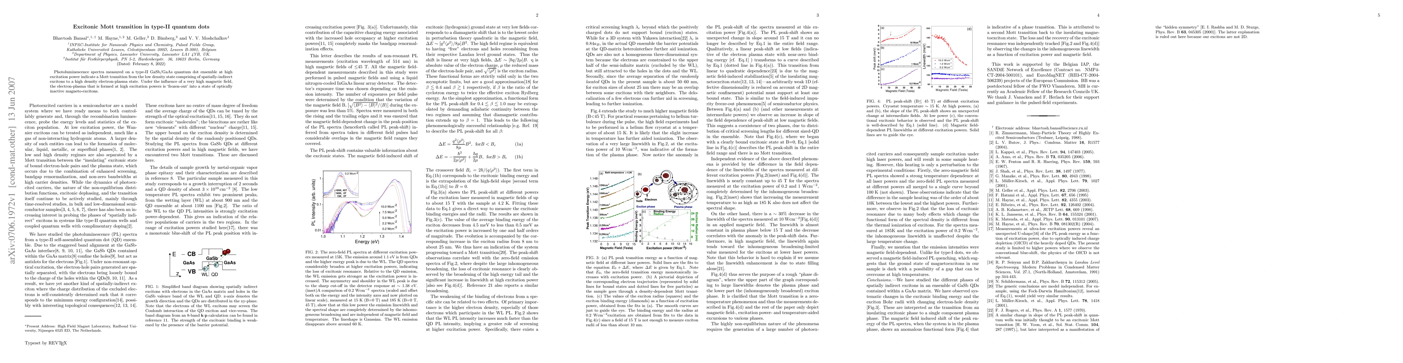 Research on type-II GaSb/GaAs quantum dots reveals a Mott transition from low density spatially-indirect excitons to a high density electron-plasma under high excitation power. In strong magnetic fields, this electron-plasma forms into optically inactive magneto-excitons, indicating a shift from excitonic to plasma-like behavior.