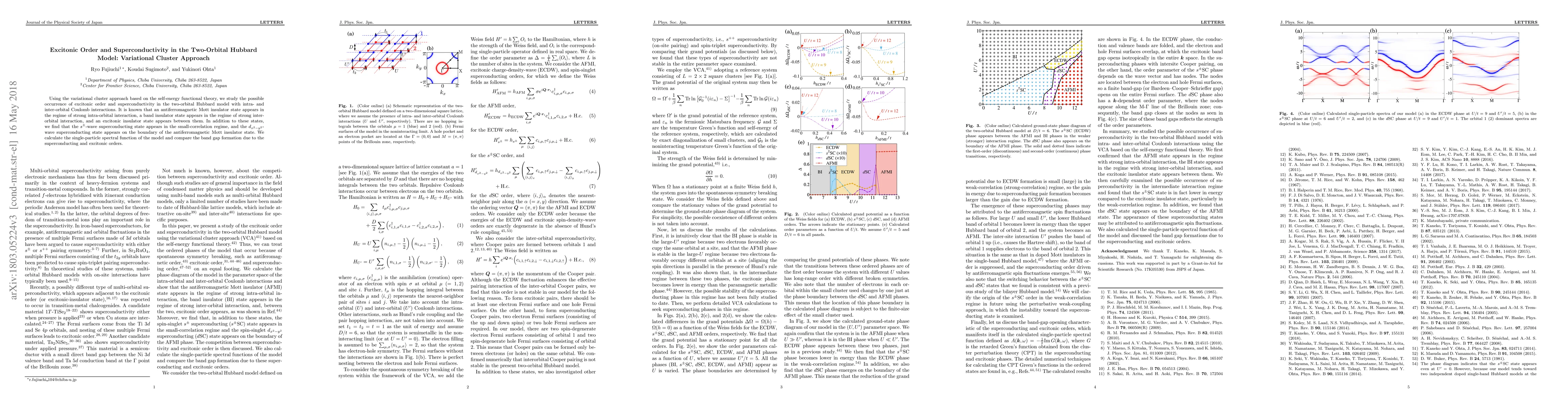 This paper employs the variational cluster approach to investigate the two-orbital Hubbard model, revealing the emergence of $s^{\pm}$-wave and $d_{x^2 - y^2}$-wave superconductivity alongside excitonic and Mott insulating states, with a focus on spectral function analysis and band gap formation.