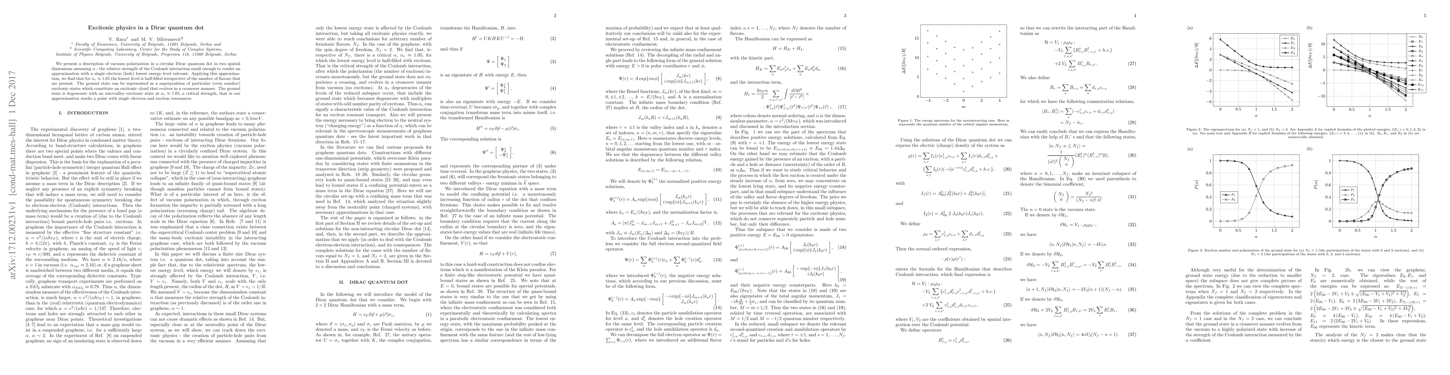 We present a description of vacuum polarization in a circular Dirac quantum dot in two spatial dimensions assuming $\alpha$ - the relative strength of the Coulomb interaction small enough to render an approximation with a single electron (hole) lowest energy level relevant. Applying this approximation, we find that for $ \alpha_c \approx 1.05$ the lowest level is half-filled irrespective of the number of flavors that are present. The ground state can be represented as a superposition of particular (even number) excitonic states which constitute an excitonic cloud that evolves in a crossover manner. The ground state is degenerate with an intervalley excitonic state at $ \alpha_c \approx 1.05$, a critical strength, that in our approximation marks a point with single electron and exciton resonances.