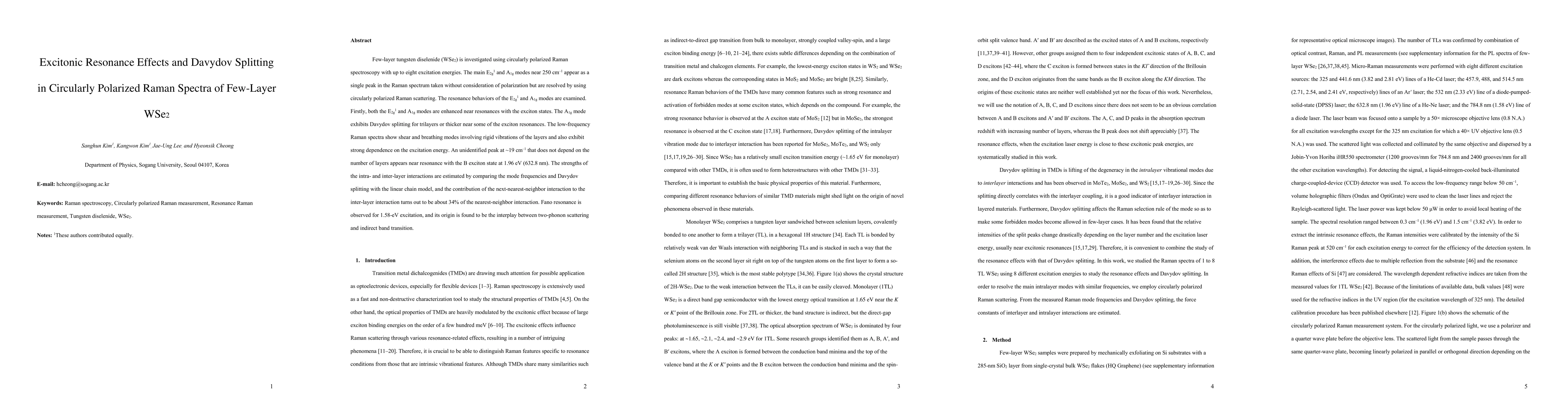 This study explores the excitonic resonance effects and Davydov splitting in circularly polarized Raman spectra of few-layer WSe2 using multiple excitation energies. The E2g1 and A1g modes show enhanced resonance near exciton states, with the A1g mode displaying Davydov splitting in thicker layers, indicating significant inter-layer interactions.