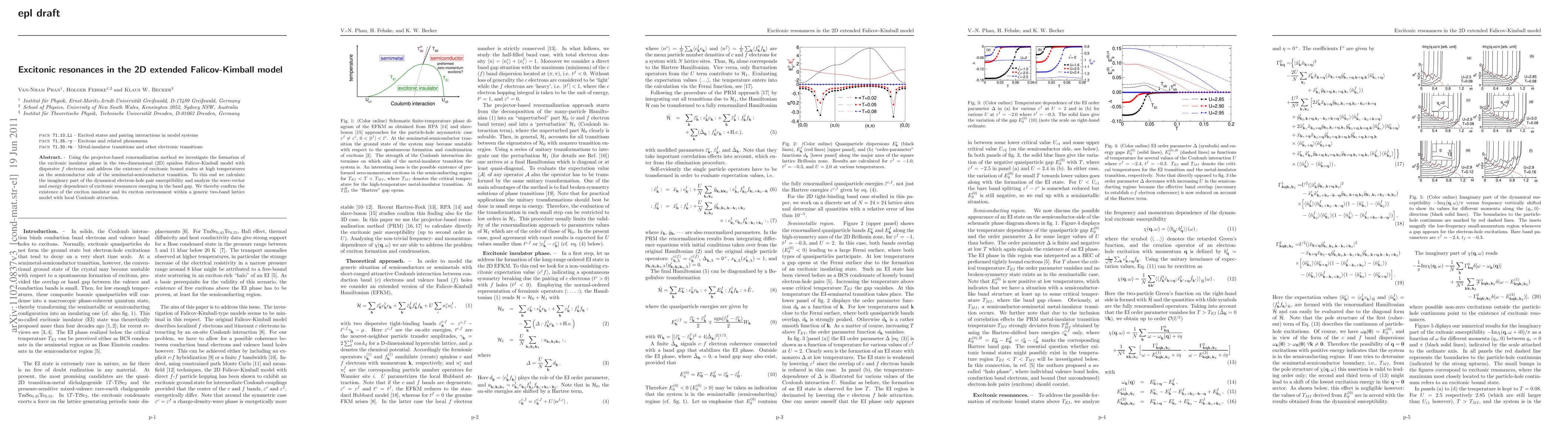 This paper investigates the excitonic insulator phase in the 2D extended Falicov-Kimball model using the projector-based renormalization method, confirming the existence of excitonic bound states and resonances in the band gap. The study highlights the excitonic environment and its formation in a two-band lattice model with local Coulomb interactions.
