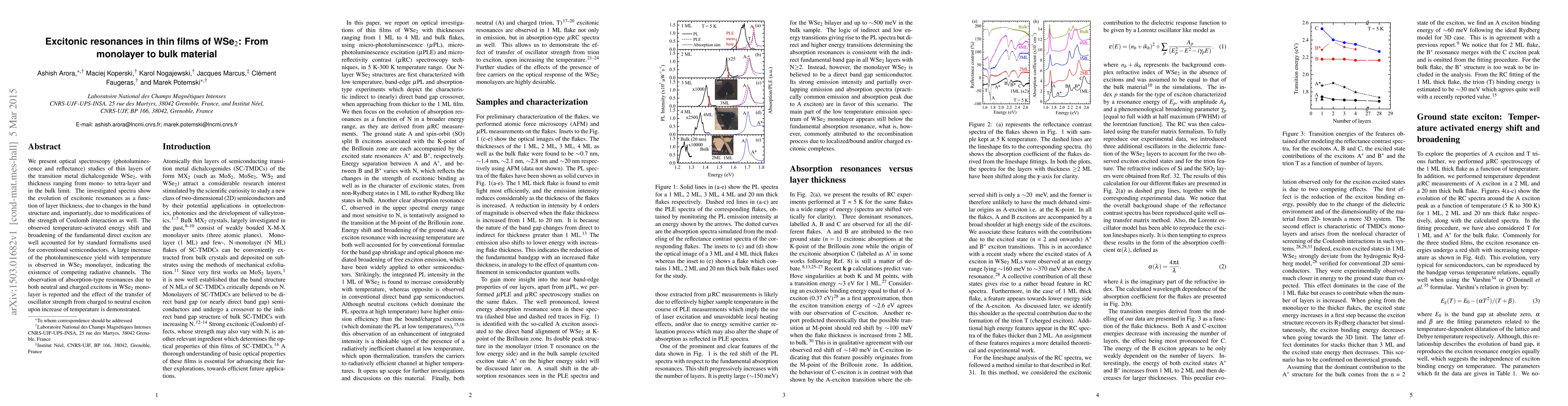 This paper investigates the optical properties of WSe2 thin films using photoluminescence and reflectance spectroscopy, revealing how excitonic resonances evolve from monolayer to bulk. The study highlights changes in band structure and Coulomb interaction strength, noting a significant temperature-dependent increase in photoluminescence yield in monolayers, indicative of competing radiative channels.