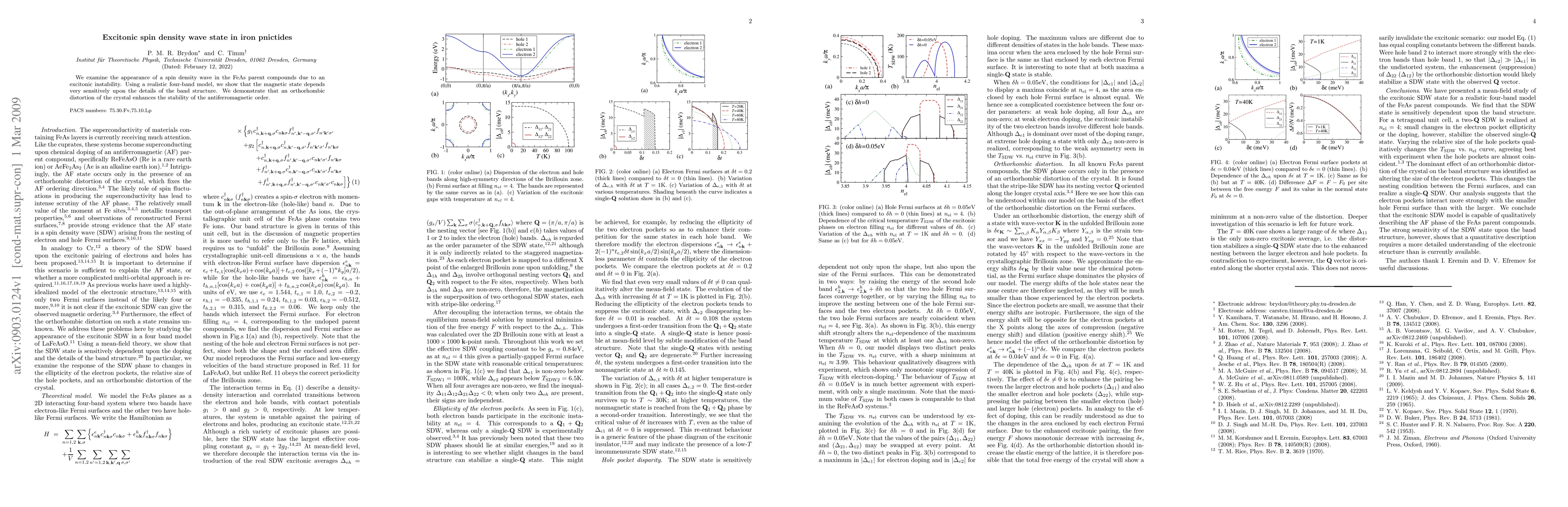 This research explores the emergence of a spin density wave in iron pnictides driven by excitonic instability, revealing that the magnetic state is highly sensitive to band structure details. The study finds that an orthorhombic distortion significantly stabilizes the antiferromagnetic order.