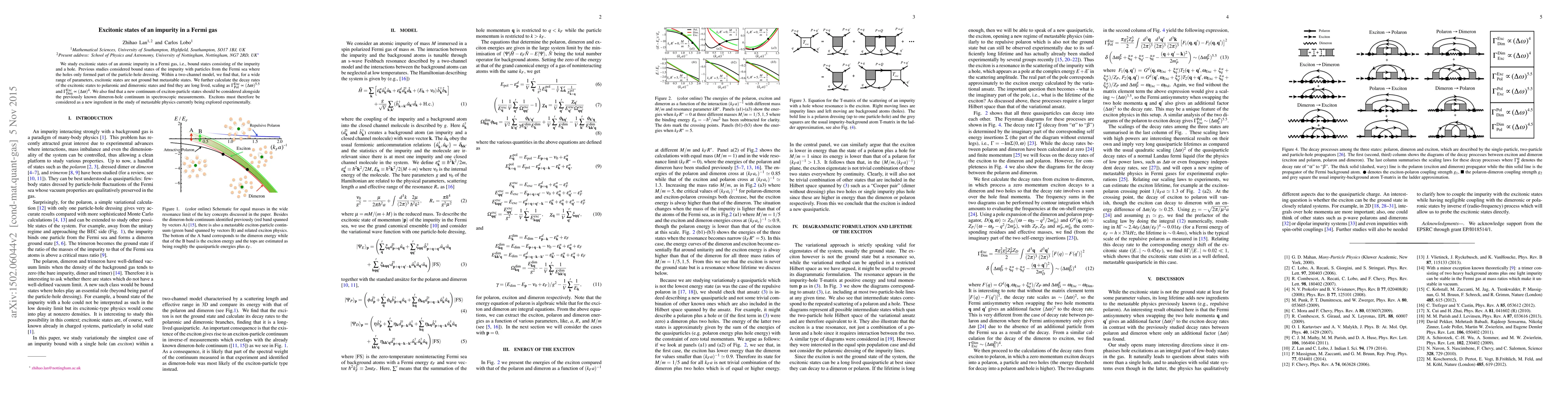 This paper investigates excitonic states formed by an atomic impurity and a hole in a Fermi gas, finding they are metastable rather than ground states. The study reveals that these states have long decay rates to polaronic and dimeronic states, suggesting their importance in metastable physics.