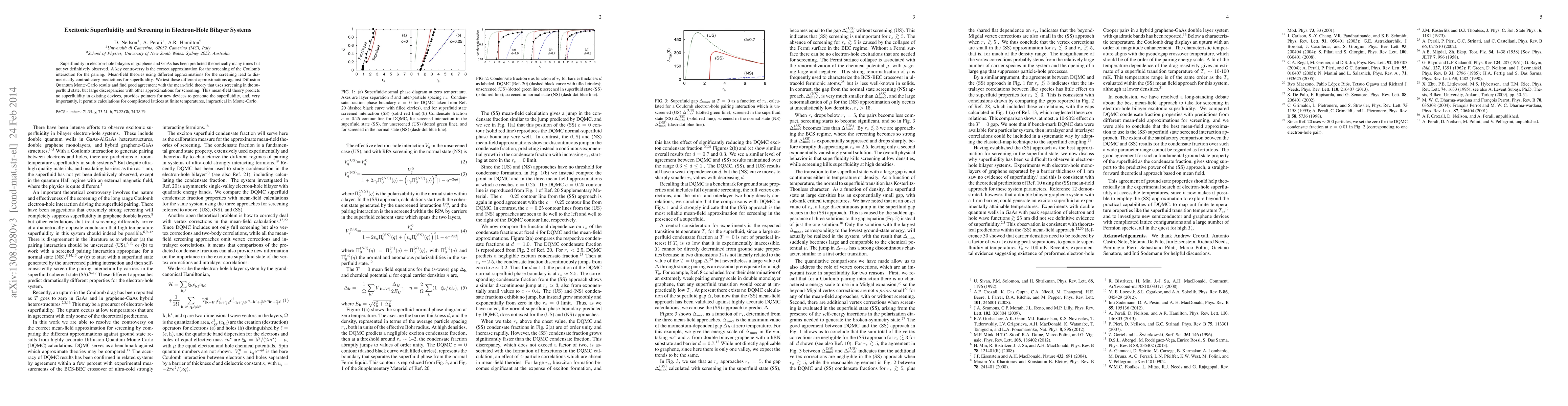 Superfluidity in e-h bilayers in graphene and GaAs has been predicted many times but not observed. A key problem is how to treat the screening of the Coulomb interaction for pairing. Different mean-field theories give dramatically different conclusions, and we test them against diffusion Monte-Carlo calculations. We get excellent agreement with the mean-field theory that uses screening in the superfluid state, but large discrepancies with the others. The theory predicts no superfluidity in existing devices and gives pointers for new devices to generate superfluidity.