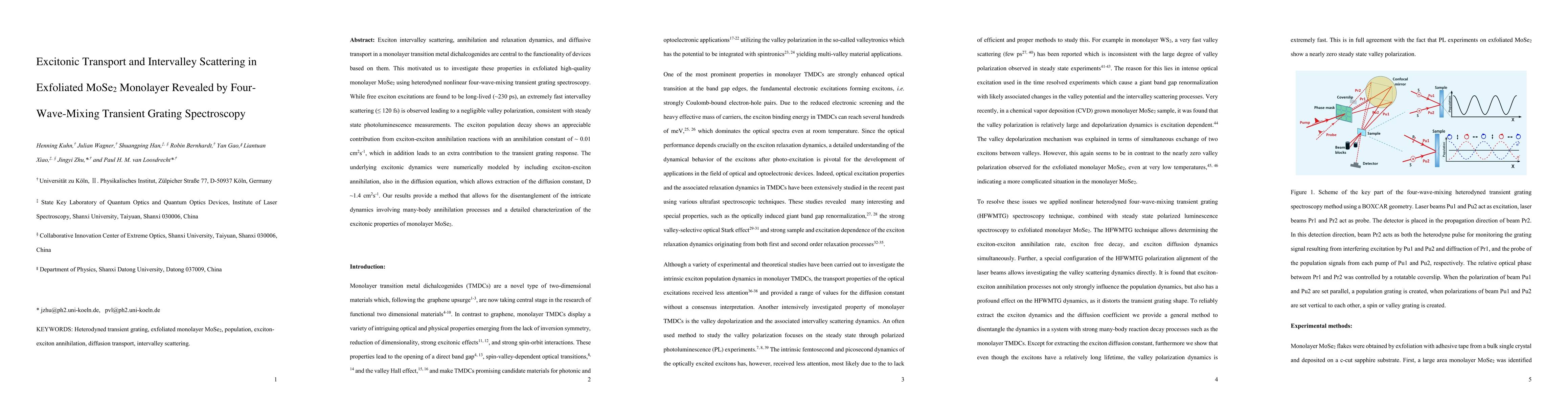 Exciton intervalley scattering, annihilation and relaxation dynamics, and diffusive transport in a monolayer transition metal dichalcogenides are central to the functionality of devices based on them. This motivated us to investigate these properties in exfoliated high-quality monolayer MoSe2 using heterodyned nonlinear four-wave-mixing transient grating spectroscopy. While free exciton excitations are found to be long-lived (~230 ps), an extremely fast intervalley scattering ( less than 120 fs) is observed leading to a negligible valley polarization, consistent with steady state photoluminescence measurements. The exciton population decay shows an appreciable contribution from exciton-exciton annihilation reactions with an annihilation constant of ~ 0.01 cm2s-1, which in addition leads to an extra contribution to the transient grating response. The underlying excitonic dynamics were numerically modeled by including exciton-exciton annihilation, also in the diffusion equation, which allows extraction of the diffusion constant, D ~1.4 cm2s-1. Our results provide a method that allows for the disentanglement of the intricate dynamics involving many-body annihilation processes and a detailed characterization of the excitonic properties of monolayer MoSe2