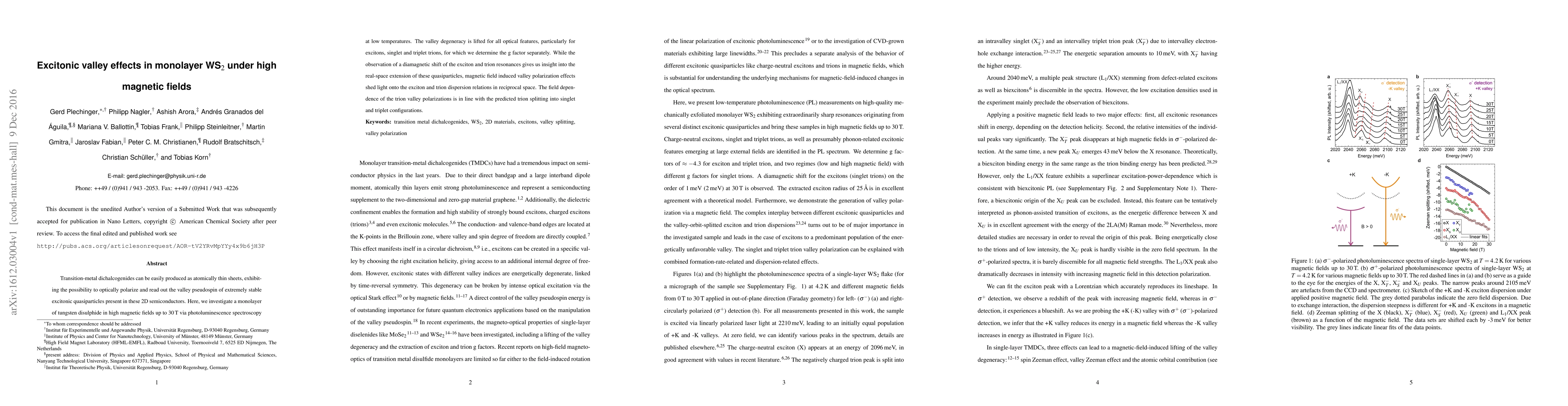 Transition-metal dichalcogenides can be easily produced as atomically thin sheets, exhibiting the possibility to optically polarize and read out the valley pseudospin of extremely stable excitonic quasiparticles present in these 2D semiconductors. Here, we investigate a monolayer of tungsten disulphide in high magnetic fields up to 30\,T via photoluminescence spectroscopy at low temperatures. The valley degeneracy is lifted for all optical features, particularly for excitons, singlet and triplet trions, for which we determine the g factor separately. While the observation of a diamagnetic shift of the exciton and trion resonances gives us insight into the real-space extension of these quasiparticles, magnetic field induced valley polarization effects shed light onto the exciton and trion dispersion relations in reciprocal space. The field dependence of the trion valley polarizations is in line with the predicted trion splitting into singlet and triplet configurations.