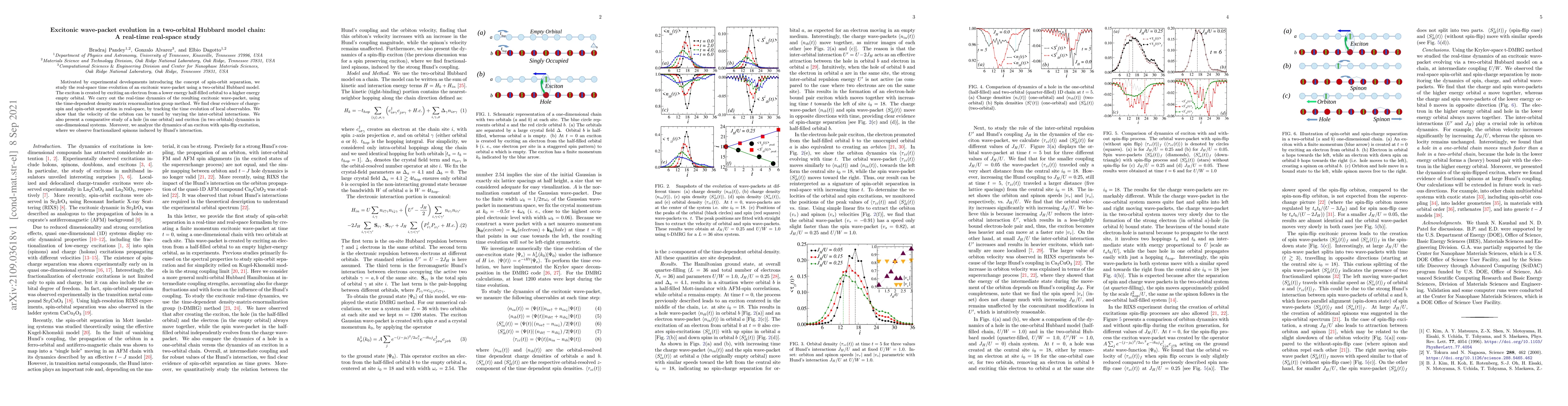Motivated by experimental developments introducing the concept of spin-orbit separation, we study the real-space time evolution of an excitonic wave-packet using a two-orbital Hubbard model. The exciton is created by exciting an electron from a lower energy half-filled orbital to a higher energy empty orbital. We carry out the real-time dynamics of the resulting excitonic wave-packet, using the time-dependent density matrix renormalization group method. We find clear evidence of charge-spin and spin-orbit separation in real-space, by tracking the time evolution of local observables. We show that the velocity of the orbiton can be tuned by varying the inter-orbital interactions. We also present a comparative study of a hole (in one orbital) and exciton (in two orbitals) dynamics in one-dimensional systems. Moreover, we analyze the dynamics of an exciton with spin-flip excitation, where we observe fractionalized spinons induced by Hund's interaction.