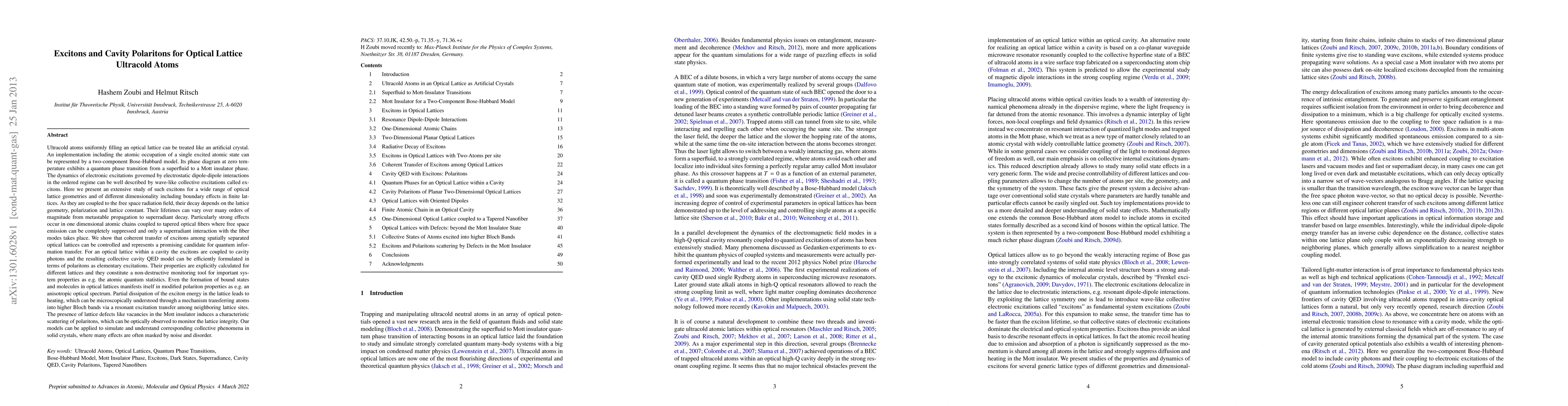 Ultracold atoms uniformly filling an optical lattice can be treated like an artificial crystal. An implementation including the atomic occupation of a single excited atomic state can be represented by a two-component Bose-Hubbard model. Its phase diagram exhibits a quantum phase transition from a superfluid to a Mott insulator phase. The dynamics of electronic excitations governed by electrostatic dipole-dipole interactions in the ordered regime can be well described by wave-like collective excitations called excitons. Here we present an extensive study of such excitons for a wide range of geometries and dimensionality. Their lifetimes can vary over many orders of magnitude from metastable propagation to superradiant decay. Particularly strong effects occur in one dimensional atomic chains coupled to tapered optical fibers. For an optical lattice within a cavity the excitons are coupled to cavity photons and the resulting collective cavity QED model can be efficiently formulated in terms of polaritons. Their properties are explicitly calculated for different lattices and they constitute a non-destructive monitoring tool for important system properties. Even the formation of molecules in optical lattices manifests itself in modified polariton properties as e.g. an anisotropic optical spectrum. Partial dissipation of the exciton energy in the lattice leads to heating, which can be microscopically understood through a mechanism transferring atoms into higher Bloch bands via a resonant excitation transfer among neighboring lattice sites. The presence of lattice defects like vacancies in the Mott insulator induces a characteristic scattering of polaritons, which can be optically observed to monitor the lattice integrity. Our models can be applied to simulate and understand corresponding collective phenomena in solid crystals, where many effects are often masked by noise and disorder.