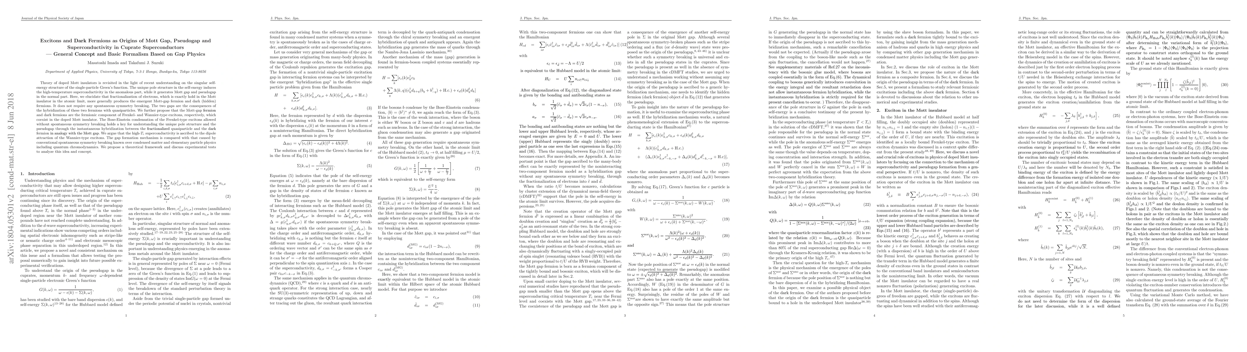 Theory of doped Mott insulators is revisited in the light of recent understanding on the singular self-energy structure of the single-particle Green's function. The unique pole structure in the self-energy induces the high-temperature superconductivity in the anomalous part, while it generates Mott gap and pseudogap in the normal part. Here, we elucidate that fractionalization of electrons, which is exactly hold in the Mott insulator in the atomic limit, more generally produces the emergent Mott-gap fermion and dark (hidden) fermions. It does not require any spontaneous symmetry breaking. The two gaps are the consequences of the hybridization of these two fermions with quasiparticles. We further propose that the Mott-gap fermion and dark fermions are the fermionic component of Frenkel- and Wannier-type excitons, respectively, which coexist in the doped Mott insulator. The Bose-Einstein condensation of the Frenkel-type excitons allowed without spontaneous symmetry breaking holds a key for understanding the unique pole structure and the pseudogap through the instantaneous hybridization between the fractionalized quasiparticle and the dark fermion in analogy with the Mott gap. We argue that the high-$T_{\rm c}$ superconductivity is ascribed to the dipole attraction of the Wannier-type excitons. The gap formation mechanism is compared with that caused by conventional spontaneous symmetry breaking known over condensed matter and elementary particle physics including quantum chromodynamics. We propose a theoretical framework and discuss experimental tests to analyze this idea and concept.