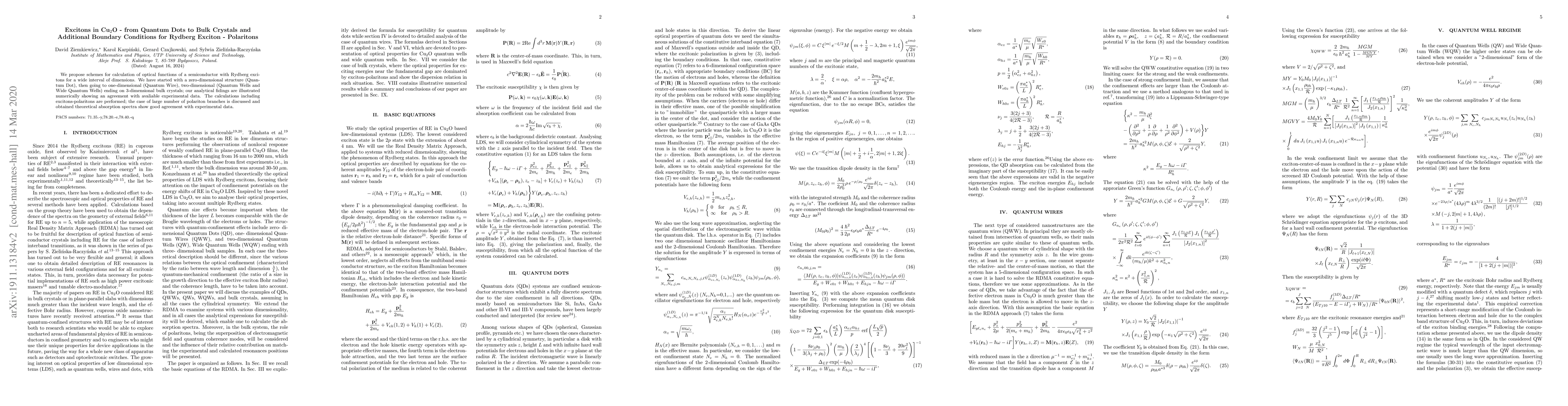 We propose a scheme for calculation of optical functions of a semiconductor with Rydberg excitons, for a wide interval of dimensions. We start with 2-dimensional structure, then going to thin films and ending on 3-dimensional bulk crystals. The calculations including the polaritons are performed, the case of large number of polariton branches is discussed and obtained theoretical absorption spectra show good agreement with experimental data.