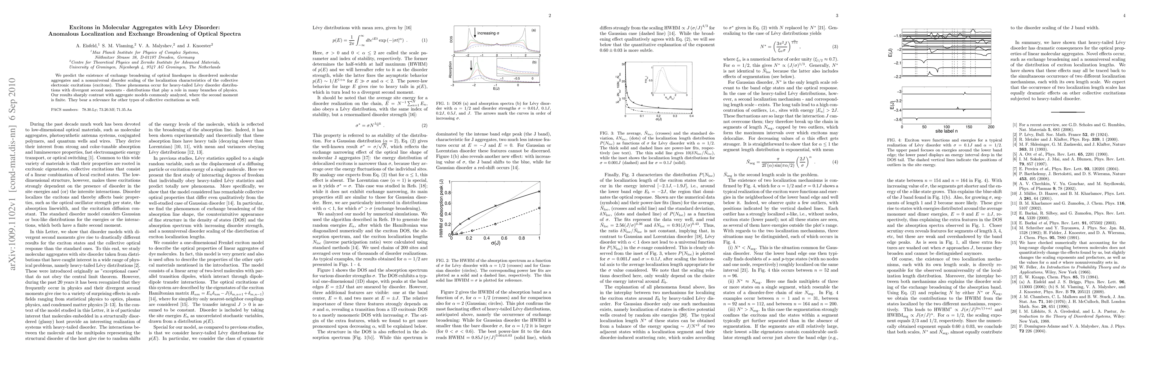 This paper predicts exchange broadening in optical spectra and nonuniversal localization scaling in disordered molecular aggregates due to L\'evy disorder, contrasting with models with finite second moments and highlighting the relevance of heavy-tailed distributions in various physical phenomena.