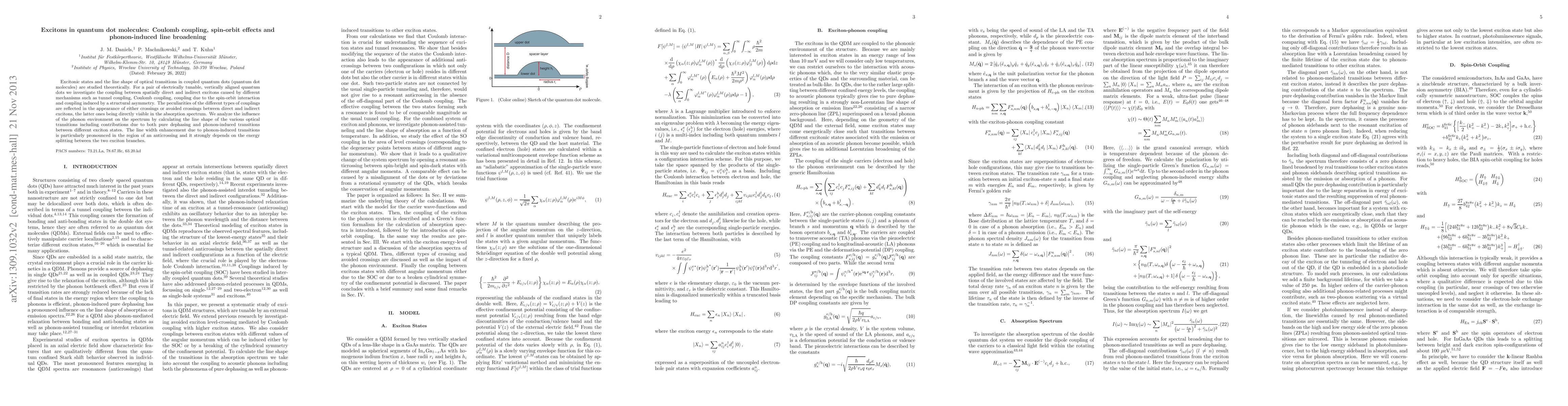 This paper theoretically examines excitonic states in coupled quantum dot molecules, analyzing the coupling mechanisms such as Coulomb, spin-orbit interactions, and structural asymmetry. It investigates how phonon-induced transitions affect the optical transition line shape, particularly noting significant line broadening near anticrossing regions due to energy splitting.