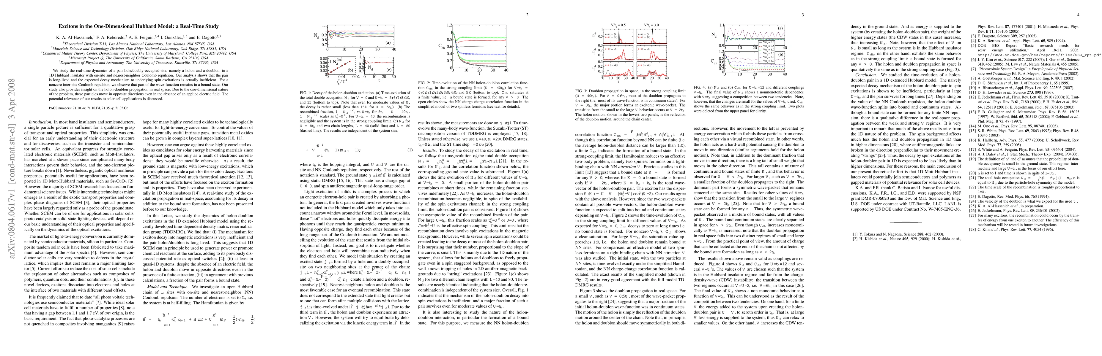 This paper investigates the real-time dynamics of holons and doublons in a 1D Hubbard model, revealing their long-lived bound state and inefficient decay to spin excitations. The study highlights the unique propagation behavior of these particles in one dimension, moving in opposite directions, with implications for solar cell technology.