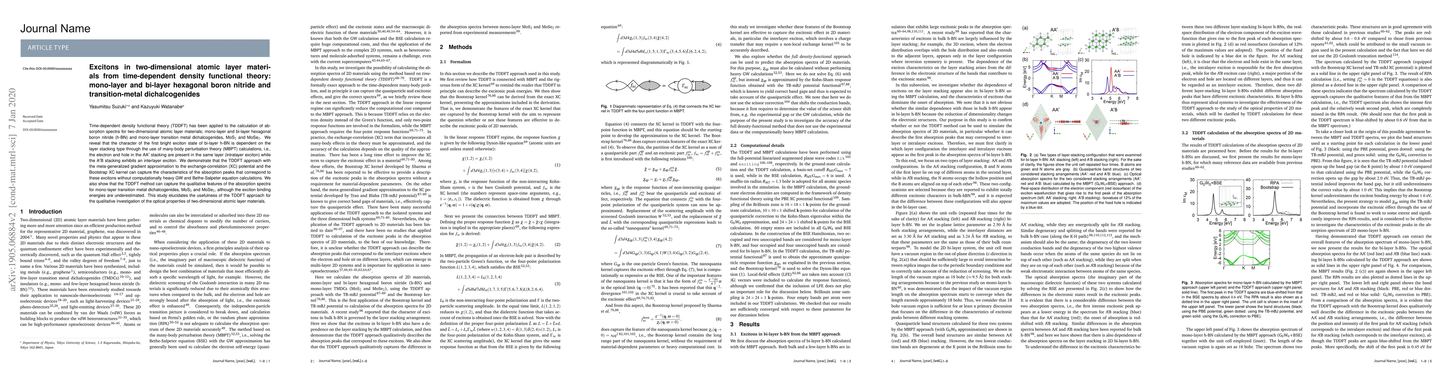 This paper uses time-dependent density functional theory (TDDFT) to investigate the absorption spectra of two-dimensional atomic layer materials, revealing that exciton states in bi-layer h-BN depend on layer stacking. TDDFT with meta-GGA and Bootstrap XC kernels effectively captures exciton-related absorption peaks without the need for computationally intensive GW and Bethe-Salpeter calculations.