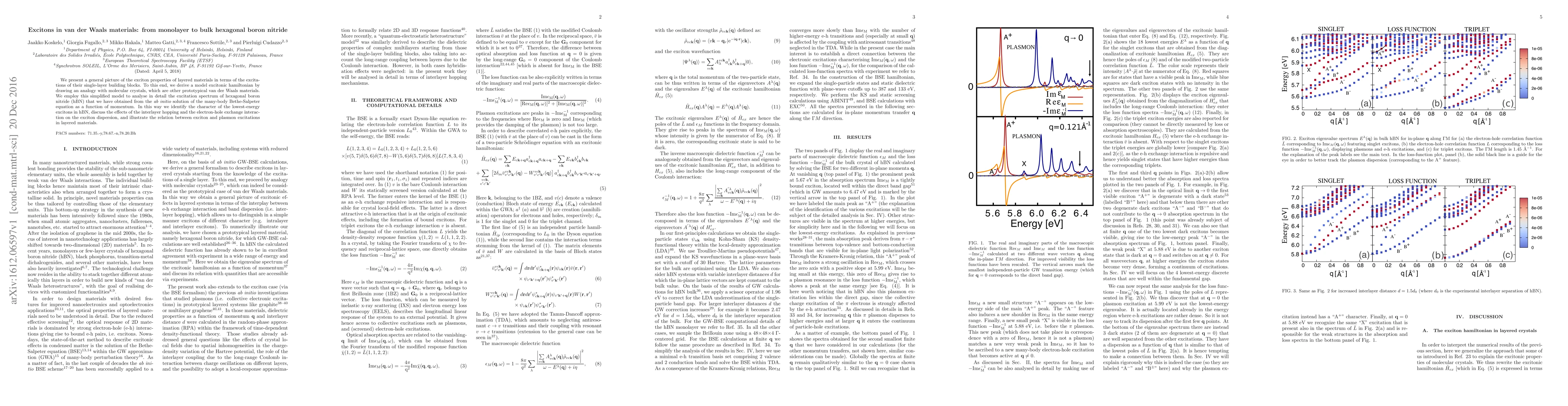 We present a general picture of the exciton properties of layered materials in terms of the excitations of their single-layer building blocks. To this end, we derive a model excitonic hamiltonian by drawing an analogy with molecular crystals, which are other prototypical van der Waals materials. We employ this simplified model to analyse in detail the excitation spectrum of hexagonal boron nitride (hBN) that we have obtained from the {\it ab initio} solution of the many-body Bethe-Salpeter equation as a function of momentum. In this way we identify the character of the lowest-energy excitons in hBN, discuss the effects of the interlayer hopping and the electron-hole exchange interaction on the exciton dispersion, and illustrate the relation between exciton and plasmon excitations in layered materials.