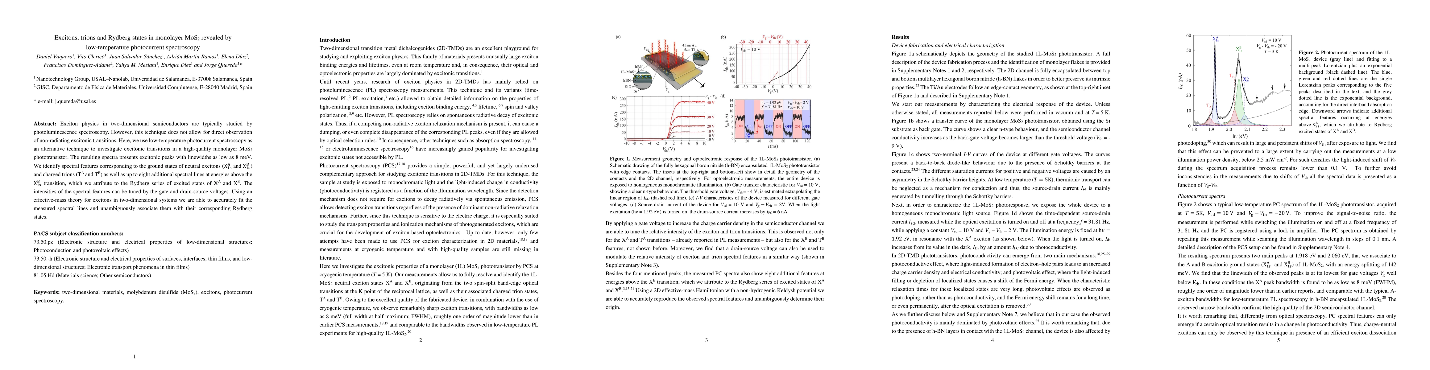 This study employs low-temperature photocurrent spectroscopy to reveal excitonic transitions in h-BN encapsulated monolayer MoS2, identifying neutral excitons, charged trions, and Rydberg states. The spectral features are accurately modeled using effective-mass theory, allowing for precise determination of the quasiparticle bandgap and exciton binding energies.