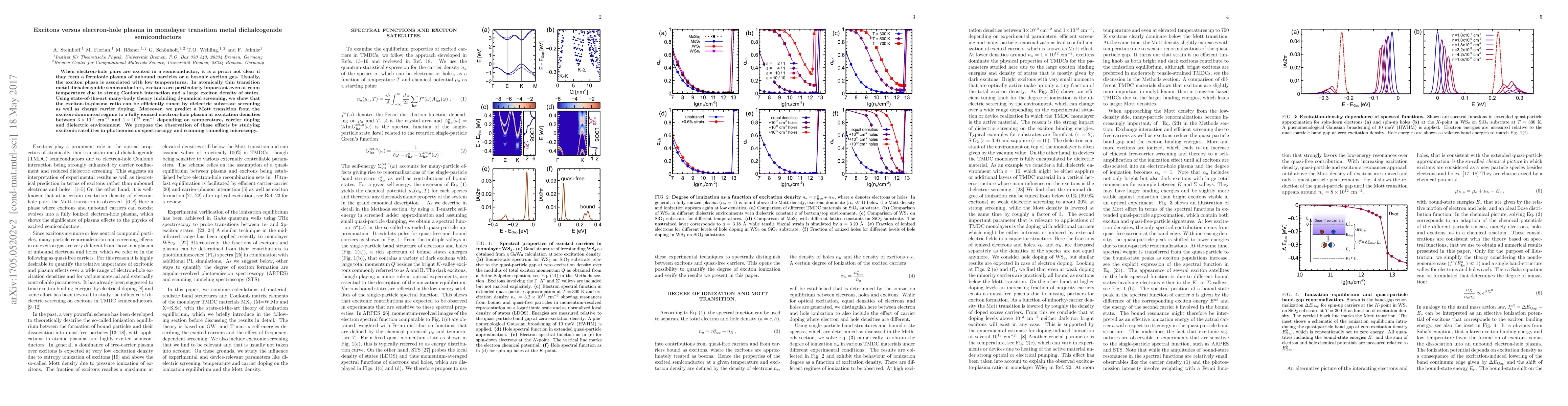 This paper explores the competition between exciton formation and electron-hole plasma in monolayer transition metal dichalcogenide semiconductors, demonstrating that dielectric substrate screening and charge carrier doping can tune the exciton-to-plasma ratio. It predicts a Mott transition to a fully ionized plasma under specific excitation densities, proposing photoemission spectroscopy and scanning tunneling microscopy for observation.