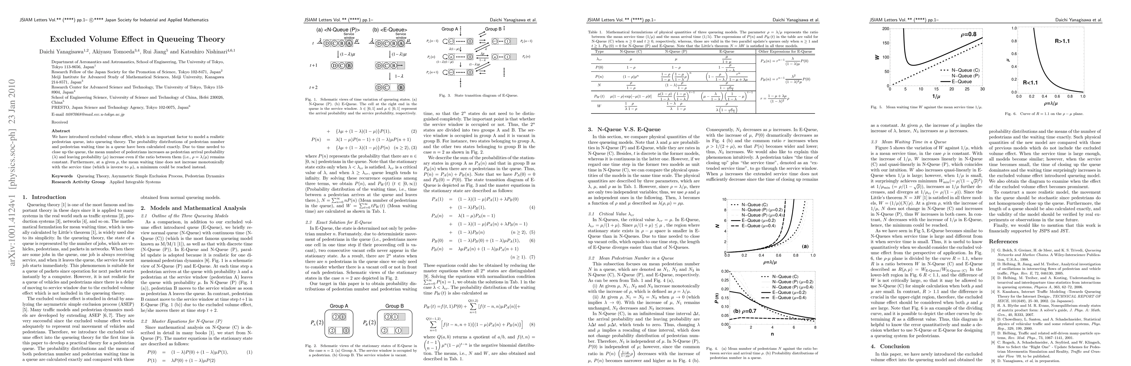 We have introduced excluded volume effect, which is an important factor to model a realistic pedestrian queue, into queueing theory. The probability distributions of pedestrian number and pedestrian waiting time in a queue have been calculated exactly. Due to time needed to close up the queue, the mean number of pedestrians increases as pedestrian arrival probability ($\lambda$) and leaving probability ($\mu$) increase even if the ratio between them (i.e., $\rho=\lambda/\mu$) remains constant. Furthermore, at a given $\rho$, the mean waiting time does not increase monotonically with the service time (which is inverse to $\mu$), a minimum could be reached instead.