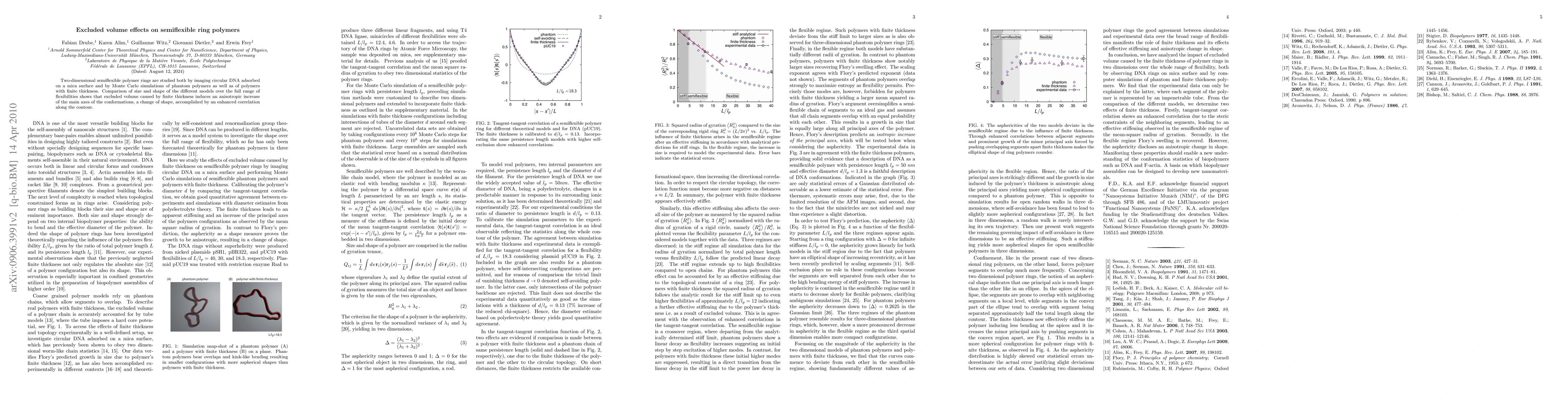This study investigates the excluded volume effects on two-dimensional semiflexible polymer rings using both experimental imaging of circular DNA and Monte Carlo simulations. The results show that finite thickness induces anisotropic conformational changes and shape alterations due to excluded volume effects.