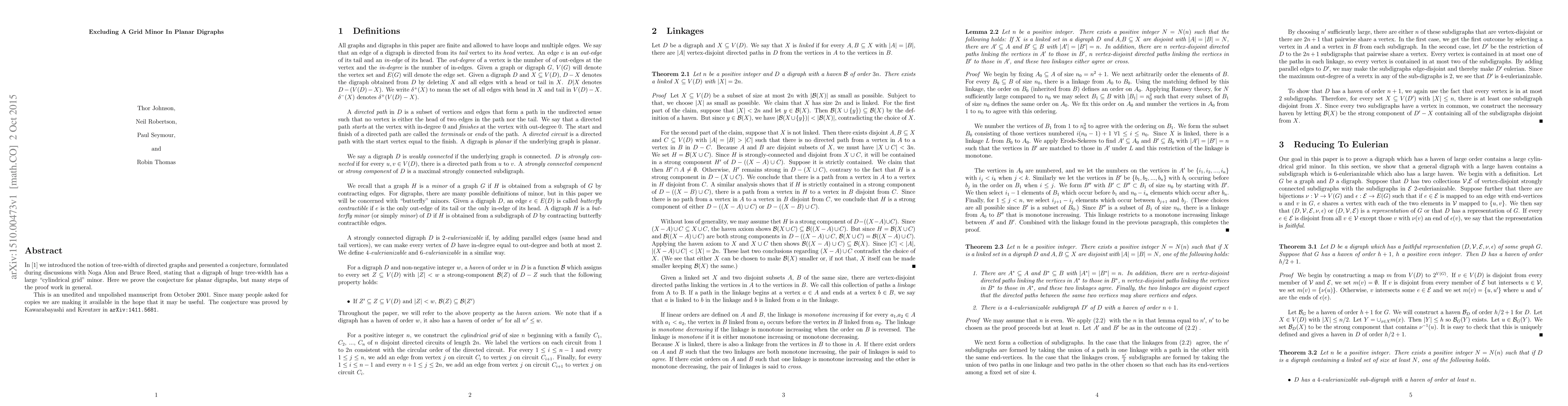 In [Directed tree-width, J. Combin. Theory Ser. B 82 (2001), 138-154] we introduced the notion of tree-width of directed graphs and presented a conjecture, formulated during discussions with Noga Alon and Bruce Reed, stating that a digraph of huge tree-width has a large "cylindrical grid" minor. Here we prove the conjecture for planar digraphs, but many steps of the proof work in general. This is an unedited and unpolished manuscript from October 2001. Since many people asked for copies we are making it available in the hope that it may be useful. The conjecture was proved by Kawarabayashi and Kreutzer in arXiv:1411.5681.