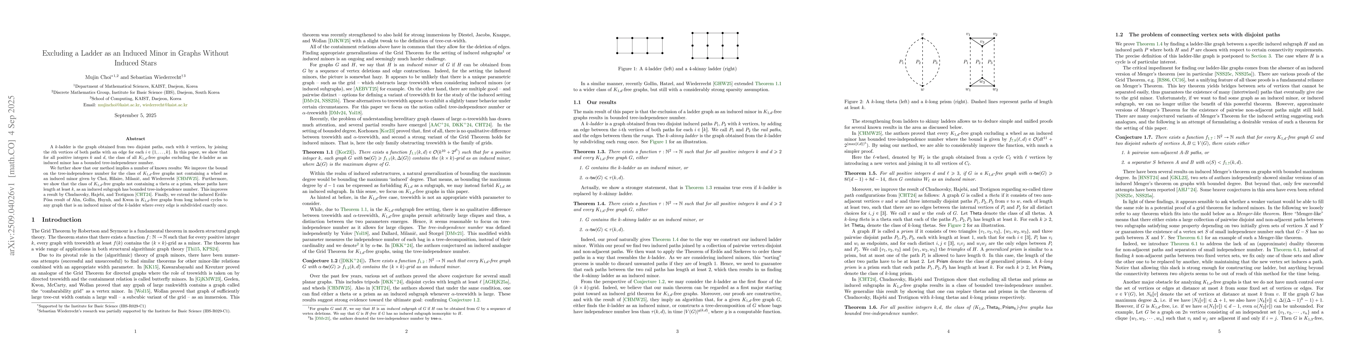 A $k$-ladder is the graph obtained from two disjoint paths, each with $k$ vertices, by joining the $i$th vertices of both paths with an edge for each $i\in\{ 1,\ldots,k\}$. In this paper, we show that for all positive integers $k$ and $d$, the class of all $K_{1,d}$-free graphs excluding the $k$-ladder as an induced minor has a bounded tree-independence number. We further show that our method implies a number of known results: We improve the bound on the tree-independence number for the class of $K_{1,d}$-free graphs not containing a wheel as an induced minor given by Choi, Hilaire, Milani\v{c}, and Wiederrecht. Furthermore, we show that the class of $K_{1,d}$-free graphs not containing a theta or a prism, whose paths have length at least $k$, as an induced subgraph has bounded tree-independence number. This improves a result by Chudnovsky, Hajebi, and Trotignon. Finally, we extend the induced Erd\H{o}s-P\'osa result of Ahn, Gollin, Huynh, and Kwon in $K_{1,d}$-free graphs from long induced cycles to any graph that is an induced minor of the $k$-ladder where every edge is subdivided exactly once.