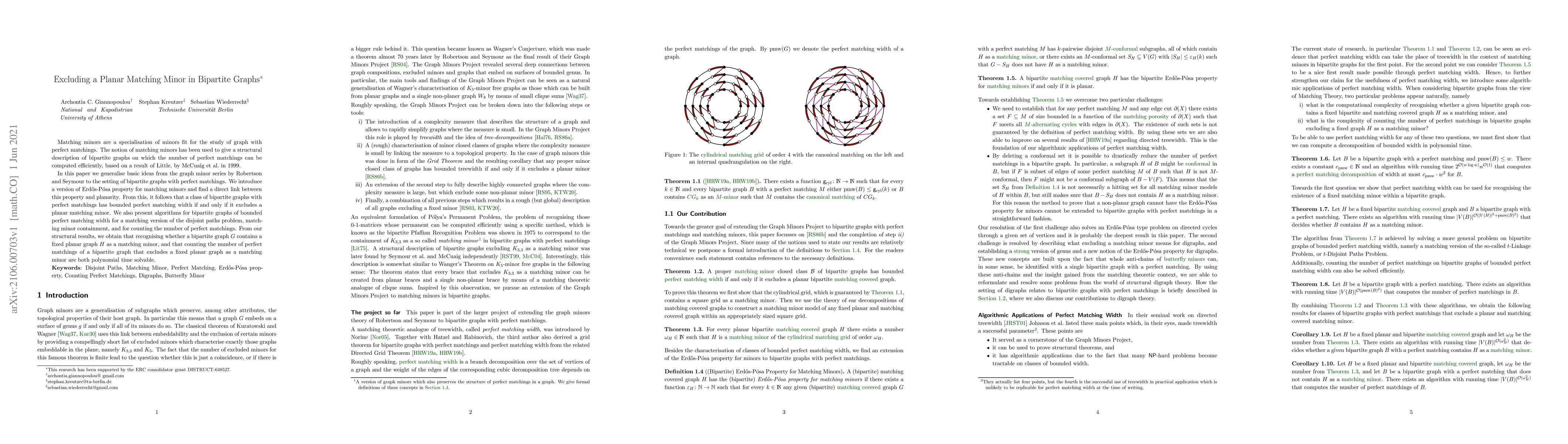 Matching minors are a specialisation of minors fit for the study of graph with perfect matchings. The notion of matching minors has been used to give a structural description of bipartite graphs on which the number of perfect matchings can becomputed efficiently, based on a result of Little, by McCuaig et al. in 1999.In this paper we generalise basic ideas from the graph minor series by Robertson and Seymour to the setting of bipartite graphs with perfect matchings. We introducea version of Erdos-Posa property for matching minors and find a direct link between this property and planarity. From this, it follows that a class of bipartite graphs withperfect matchings has bounded perfect matching width if and only if it excludes aplanar matching minor. We also present algorithms for bipartite graphs of bounded perfect matching width for a matching version of the disjoint paths problem, matching minor containment, and for counting the number of perfect matchings. From our structural results, we obtain that recognising whether a bipartite graphGcontains afixed planar graphHas a matching minor, and that counting the number of perfect matchings of a bipartite graph that excludes a fixed planar graph as a matching minor are both polynomial time solvable.
