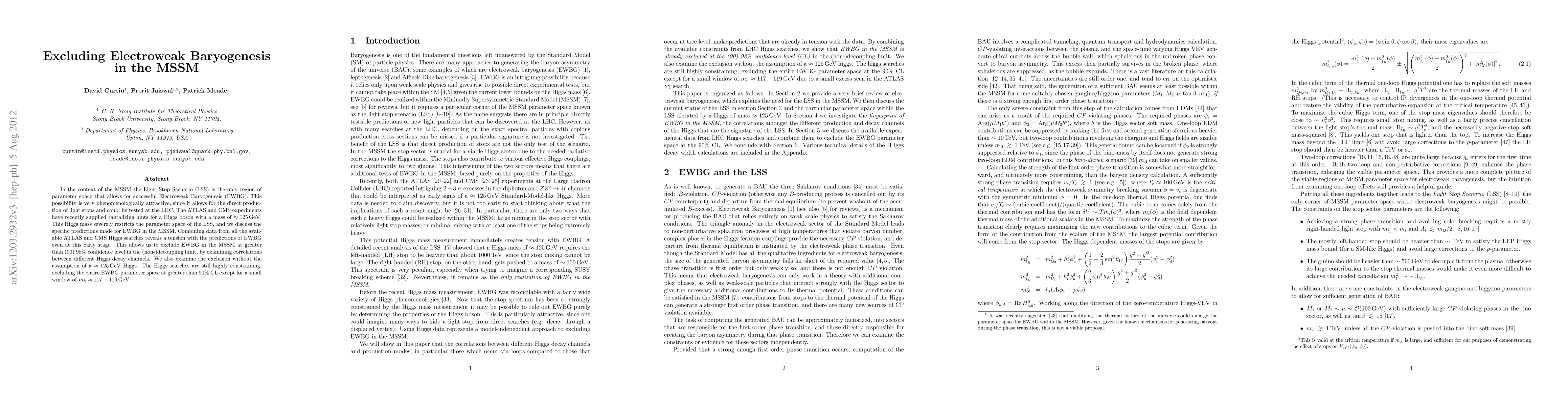 This paper examines the viability of Electroweak Baryogenesis (EWBG) in the Minimal Supersymmetric Standard Model (MSSM) under the Light Stop Scenario (LSS). Recent LHC data and a Higgs boson mass of ~125 GeV significantly restrict EWBG predictions, leading to its exclusion at over 90% confidence level in the MSSM.