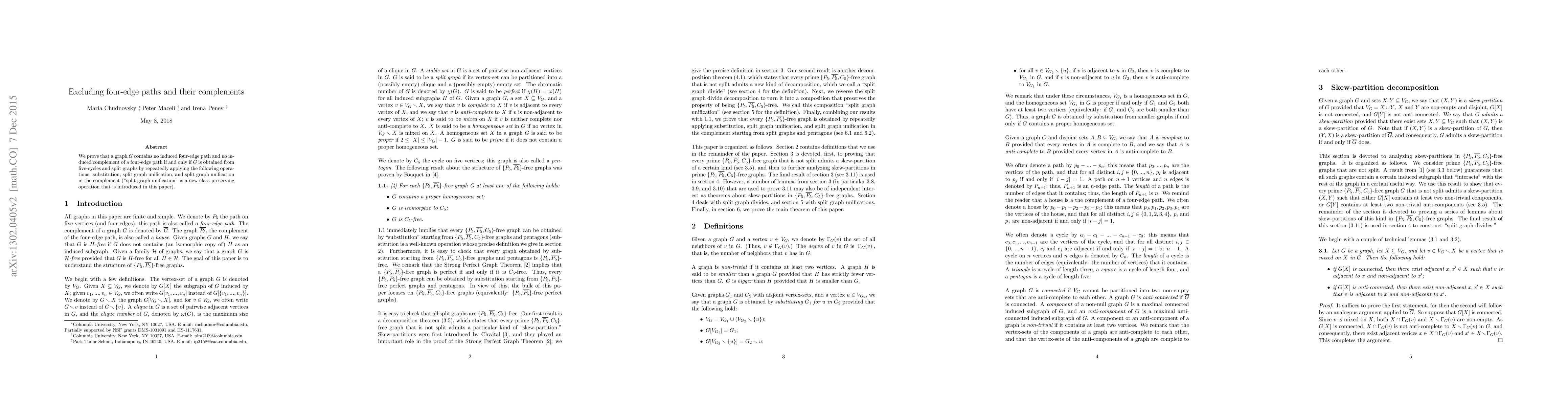 Summary: The paper establishes that a graph without induced four-edge paths and their complements is derived from five-cycles and split graphs through specific operations: substitution, split graph unification, and split graph unification in the complement. This result introduces a new operation, split graph unification, which preserves the graph class.