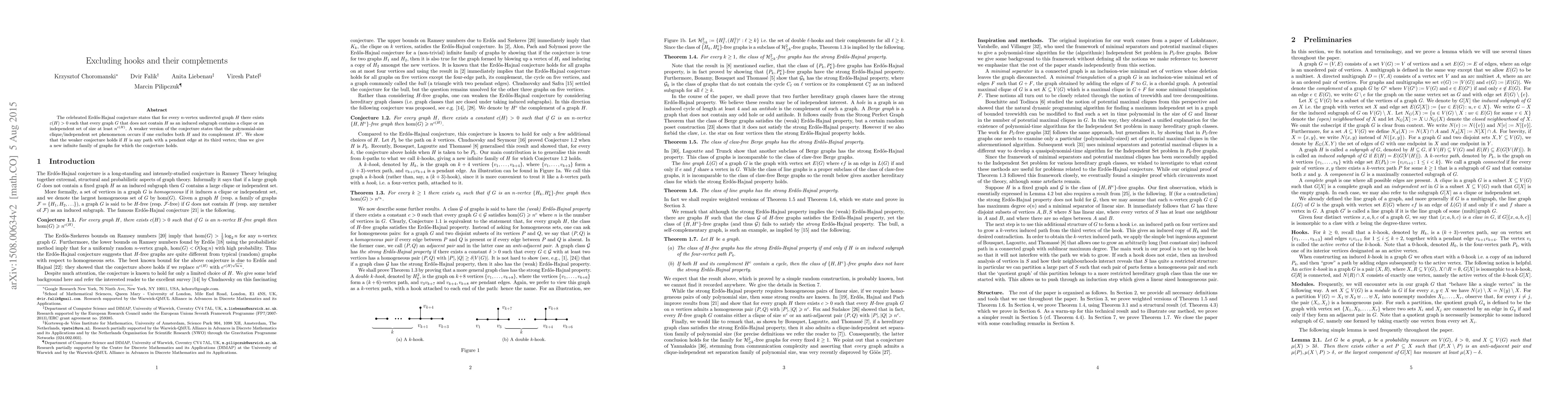 The celebrated Erdos-Hajnal conjecture states that for every $n$-vertex undirected graph $H$ there exists $\eps(H)>0$ such that every graph $G$ that does not contain $H$ as an induced subgraph contains a clique or an independent set of size at least $n^{\eps(H)}$. A weaker version of the conjecture states that the polynomial-size clique/independent set phenomenon occurs if one excludes both $H$ and its complement $H^{\compl}$. We show that the weaker conjecture holds if $H$ is any path with a pendant edge at its third vertex; thus we give a new infinite family of graphs for which the conjecture holds.