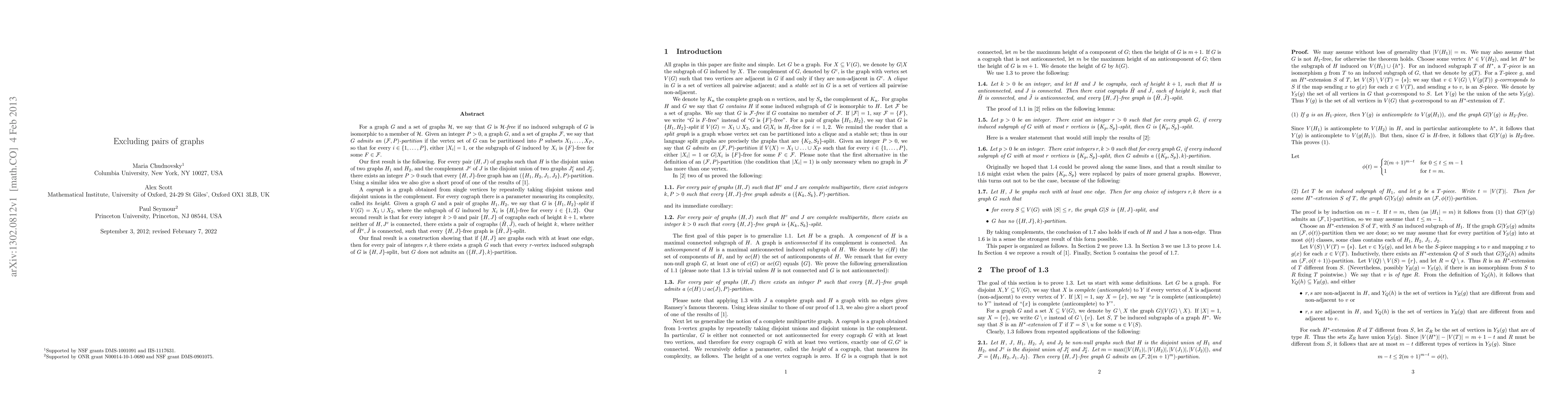 For a graph $G$ and a set of graphs $\mathcal{H}$, we say that $G$ is {\em $\mathcal{H}$-free} if no induced subgraph of $G$ is isomorphic to a member of $\mathcal{H}$. Given an integer $P>0$, a graph $G$, and a set of graphs $\mathcal{F}$, we say that $G$ {\em admits an $(\mathcal{F},P)$-partition} if the vertex set of $G$ can be partitioned into $P$ subsets $X_1,..., X_P$, so that for every $i \in \{1,..., P\}$, either $|X_i|=1$, or the subgraph of $G$ induced by $X_i$ is $\{F\}$-free for some $F \in \mathcal{F}$. Our first result is the following. For every pair $(H,J)$ of graphs such that $H$ is the disjoint union of two graphs $H_1$ and $H_2$, and the complement $J^c$ of $J$ is the disjoint union of two graphs $J_1^c$ and $J_2^c$, there exists an integer $P>0$ such that every $\{H,J\}$-free graph has an $(\{H_1,H_2,J_1,J_2\},P)$-partition. Using a similar idea we also give a short proof of one of the results of \cite{heroes}. Our final result is a construction showing that if $\{H,J\}$ are graphs each with at least one edge, then for every pair of integers $r,k$ there exists a graph $G$ such that every $r$-vertex induced subgraph of $G$ is $\{H,J\}$-split, but $G$ does not admits an $(\{H,J\},k)$-partition.