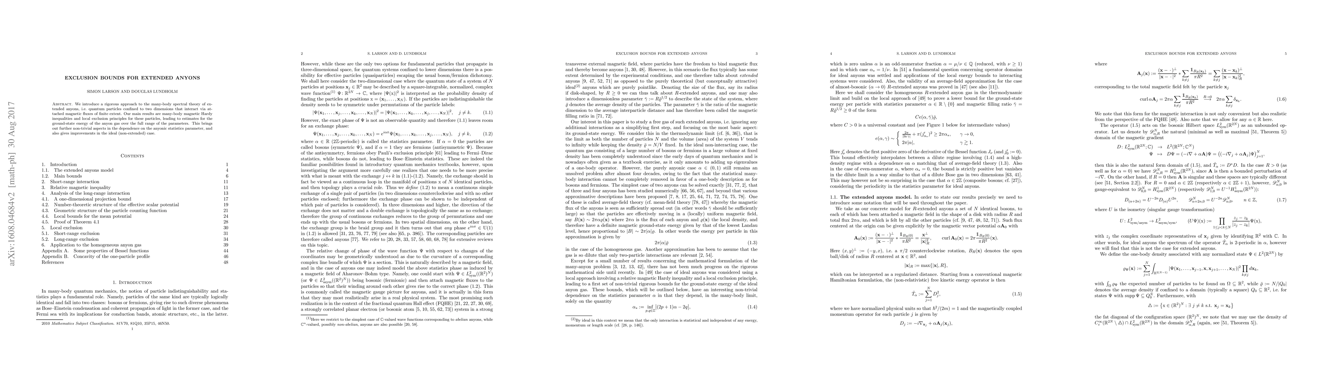 We introduce a rigorous approach to the many-body spectral theory of extended anyons, i.e. quantum particles confined to two dimensions that interact via attached magnetic fluxes of finite extent. Our main results are many-body magnetic Hardy inequalities and local exclusion principles for these particles, leading to estimates for the ground-state energy of the anyon gas over the full range of the parameters. This brings out further non-trivial aspects in the dependence on the anyonic statistics parameter, and also gives improvements in the ideal (non-extended) case.