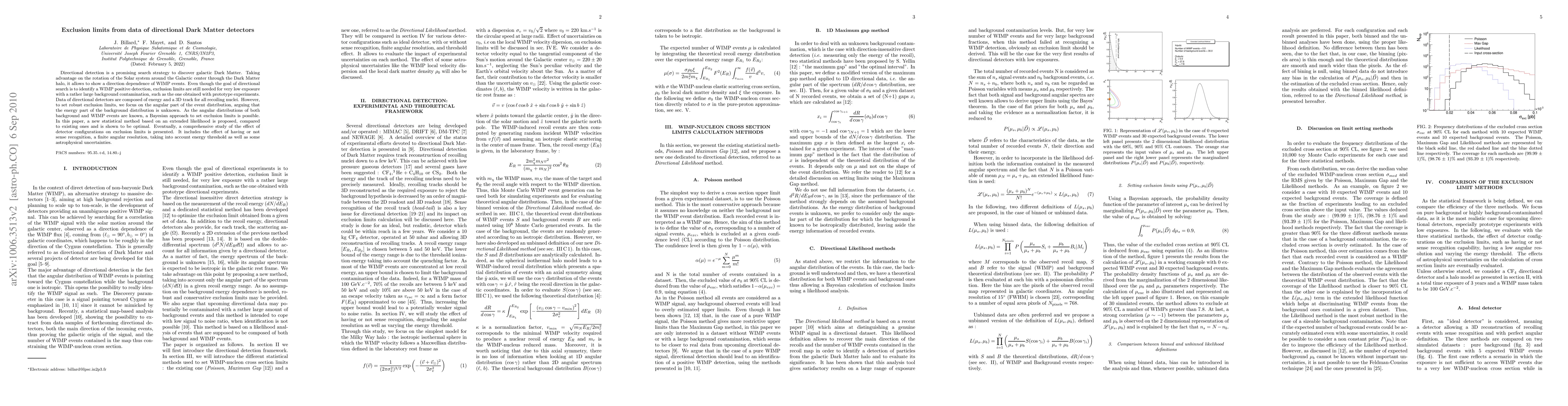 Directional detection is a promising search strategy to discover galactic Dark Matter. Taking advantage on the rotation of the Solar system around the Galactic center through the Dark Matter halo, it allows to show a direction dependence of WIMP events. Even though the goal of directional search is to identify a WIMP positive detection, exclusion limits are still needed for very low exposure with a rather large background contamination, such as the one obtained with prototype experiments. Data of directional detectors are composed of energy and 3D track of recoiling nuclei. However, to set robust exclusion limits, we focus on the angular part of the event distribution, arguing that the energy part of the WIMP distribution is featureless and may even be mimic by the background one. Then, as the angular distributions of both background and WIMP events are known, a Bayesian approach to set exclusion limits is possible. In this paper, a statistical method based on an extended likelihood is proposed, compared to existing ones and is shown to be optimal. Eventually, a comprehensive study of the effect of detector configuration on exclusion limits is presented. It includes the effect of having or not sense recognition, a finite angular resolution, taking into account energy threshold as well as some astrophysical uncertainties.